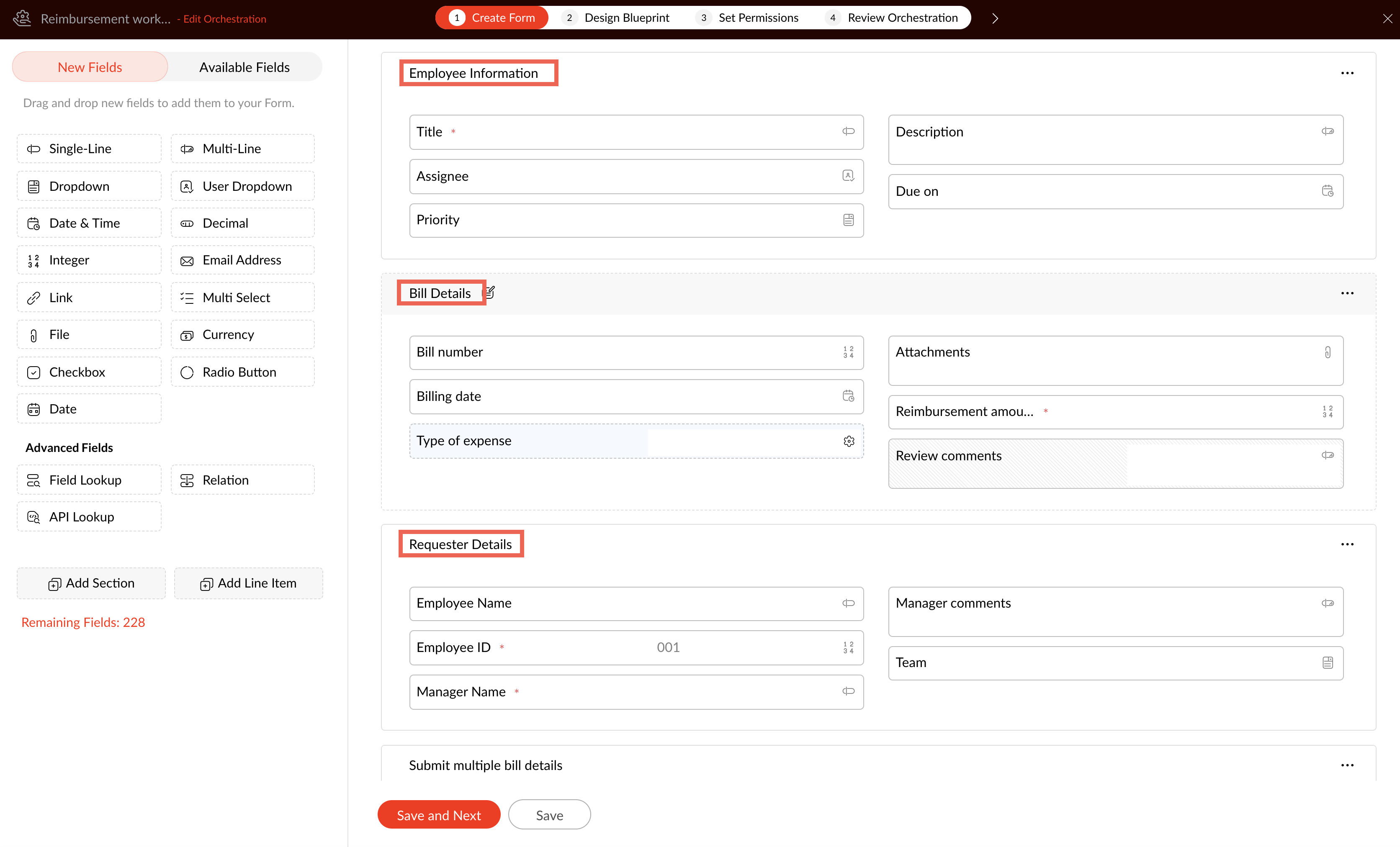 For example, while building the form for Employee Details, you can create different sections, such as Employee information, Bill Details, Requester Details.