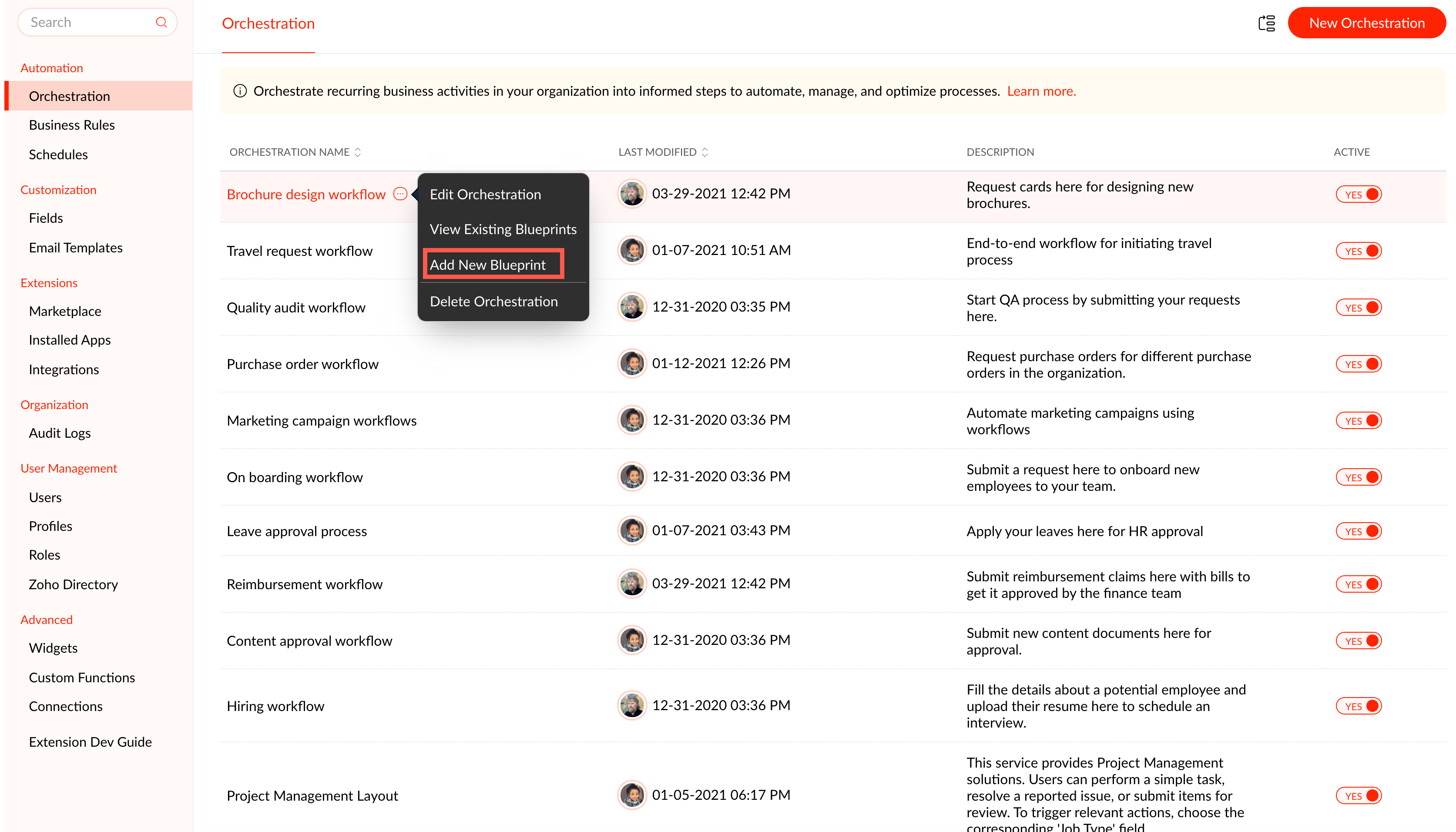 Orchestration allows organizations to automate their end-to-end workflows in one go. With orchestration, you can create forms to record user responses, design and validate blueprints that automate the organization’s processes, and control which users ...