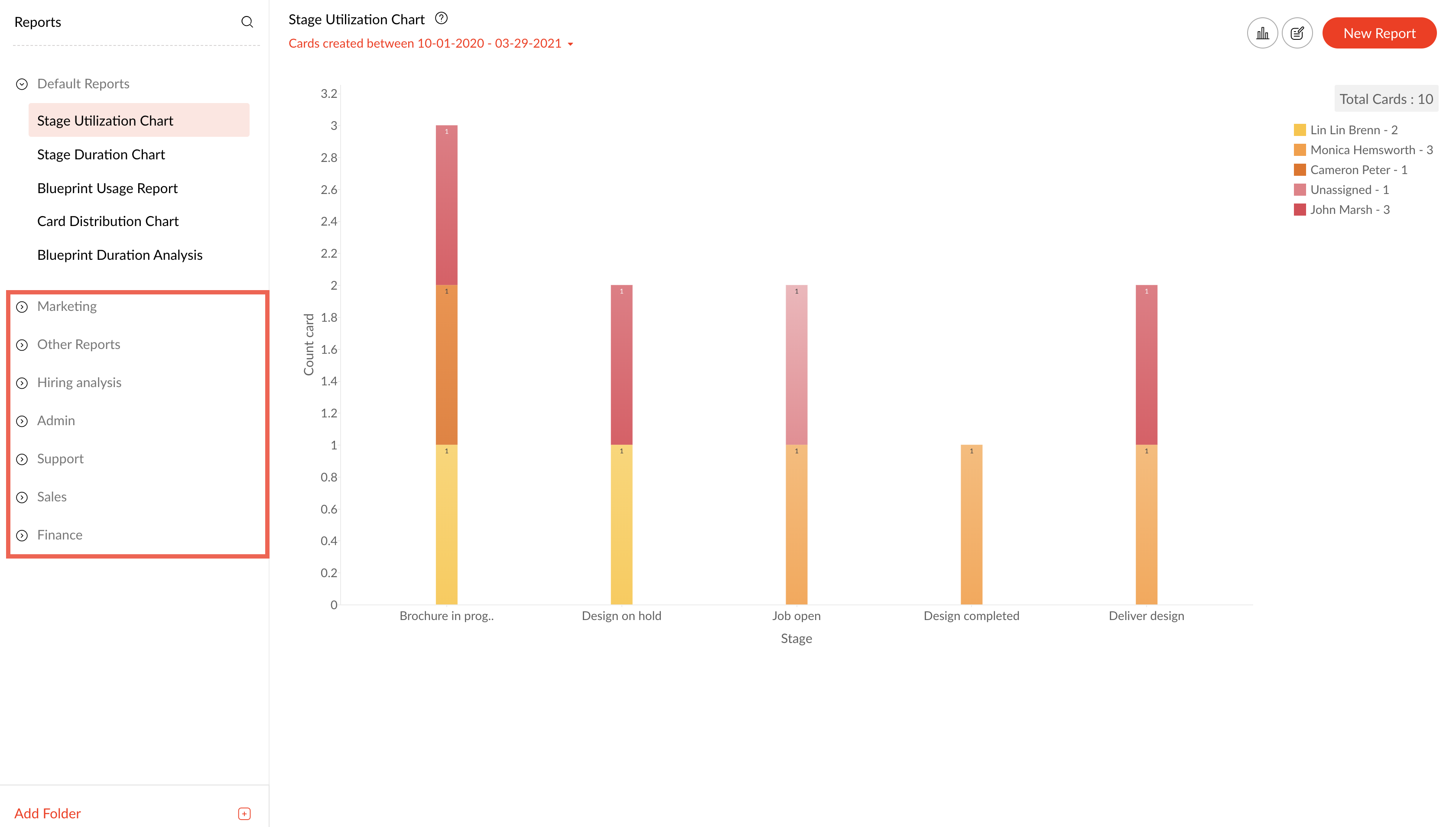 Qntrl provides default reports, including: Blueprint usage report Card distribution chart Stage duration chart Stage utilization chart Blueprint duration analysis If any of these default reports do not suit your needs, you can always create a custom ...