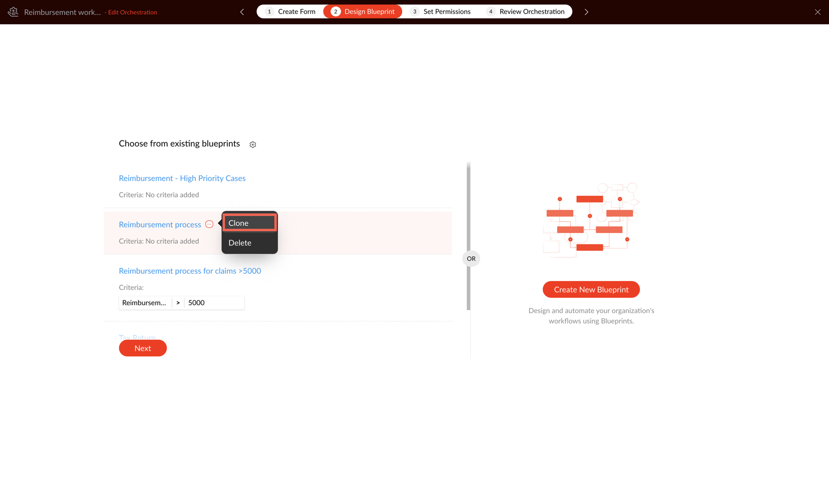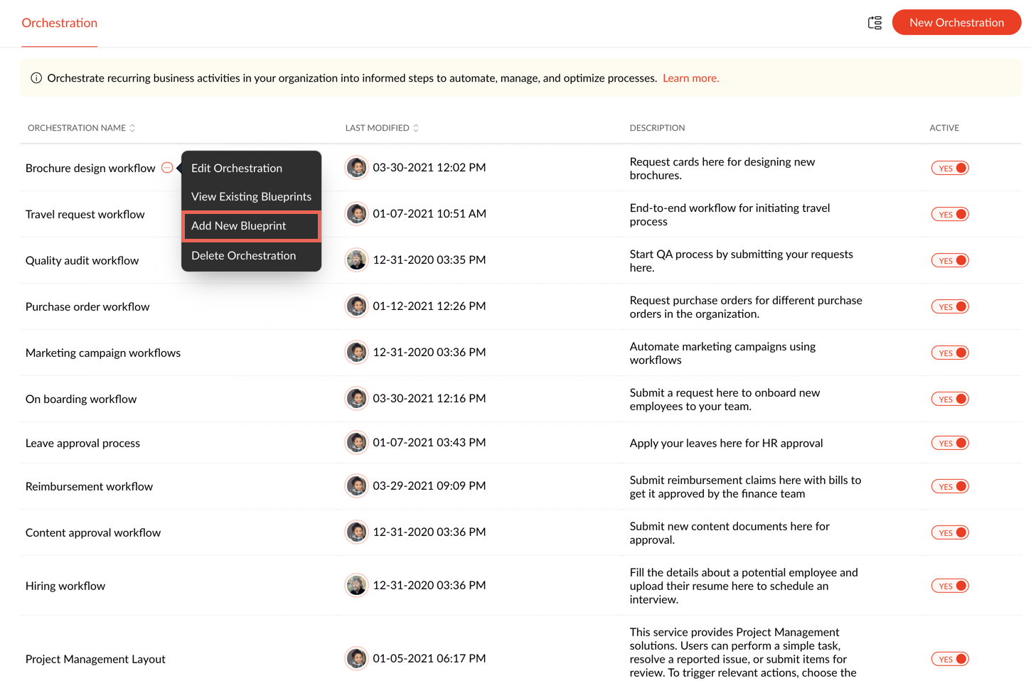 You can view the blueprints associated with an orchestration. You can also create a new blueprint here by clicking the Create New Blueprint button. To edit a blueprint, click on the required blueprint.