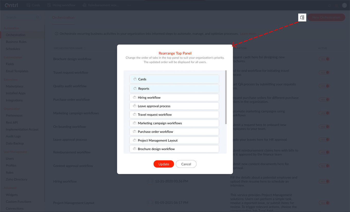 Qntrl allows you to rearrange the tabs available in the top panel such as Cards, Reports, Orchestration shortcuts, and Extensions. To rearrange the tabs,