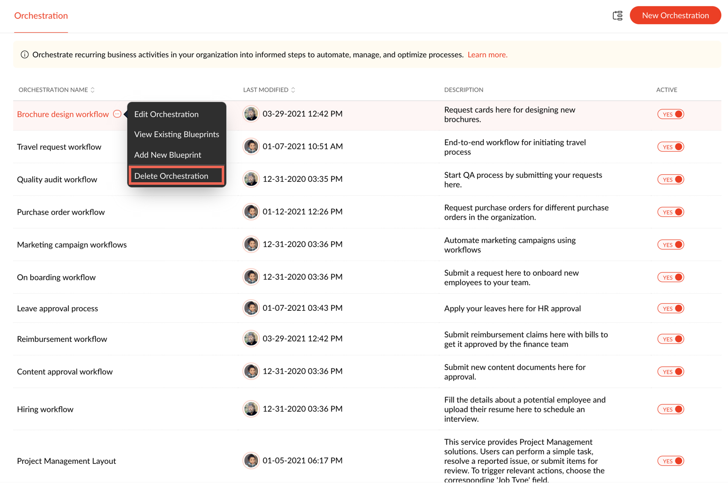When an orchestration is deleted, all the blueprints, cards, and forms created through the orchestration will also be deleted.