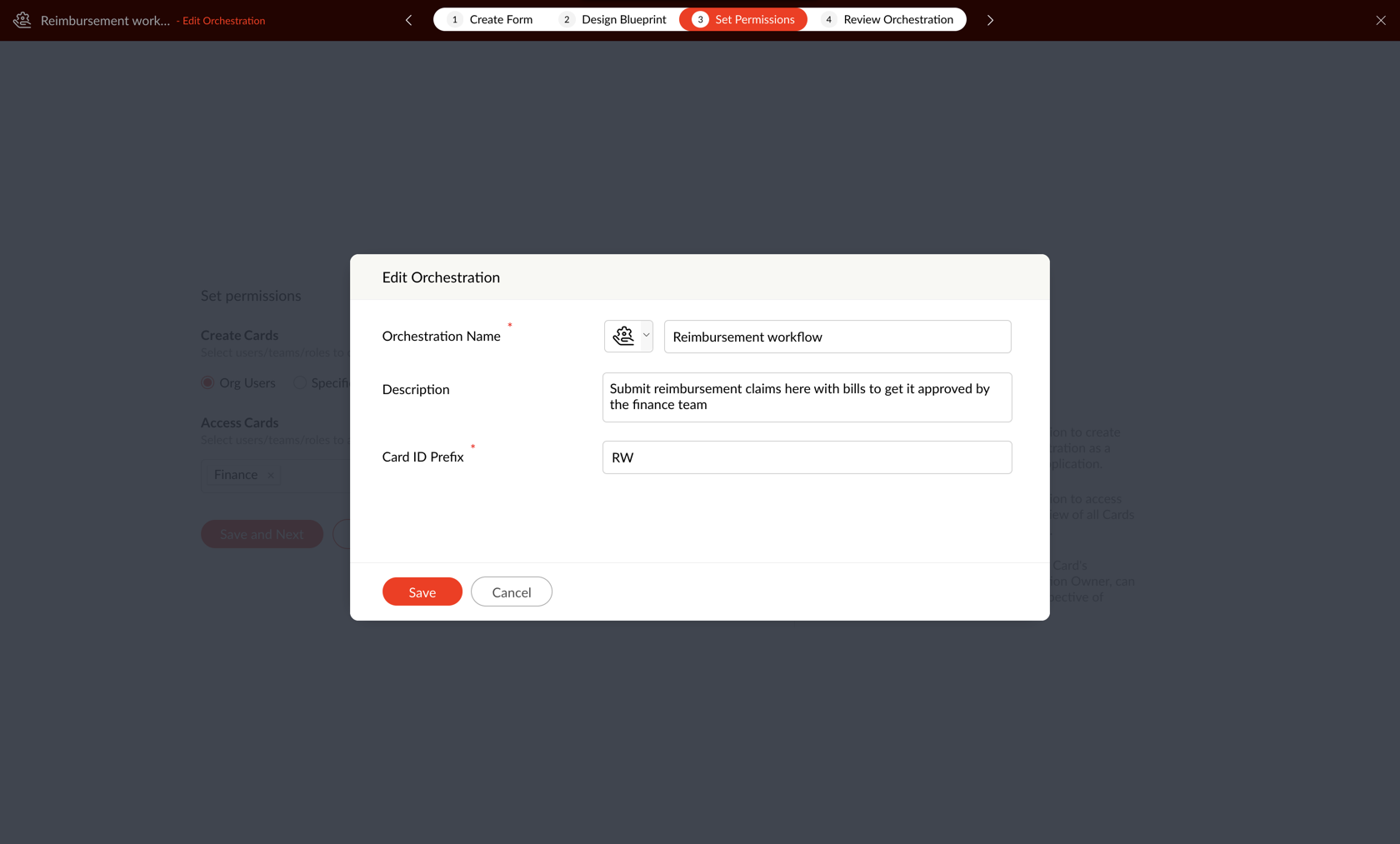 4. In the Edit Orchestration pop-up, update details like the Orchestration Name, Description, and Card ID Prefix.