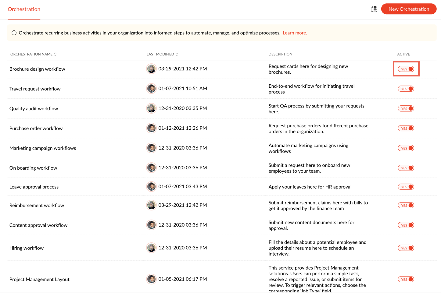 2. Toggle the button at the right end to activate or deactivate the orchestration.