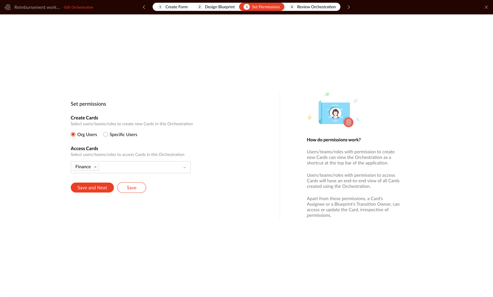 The third step of Orchestration is to Set Permissions. Qntrl allows you to set permissions for which users can create and access Cards in this orchestration.
