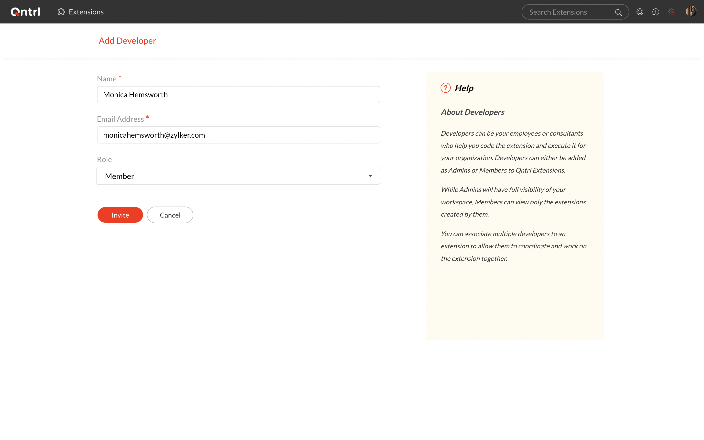 Enter the developer’s name, email address, and role with respect to the workspace.