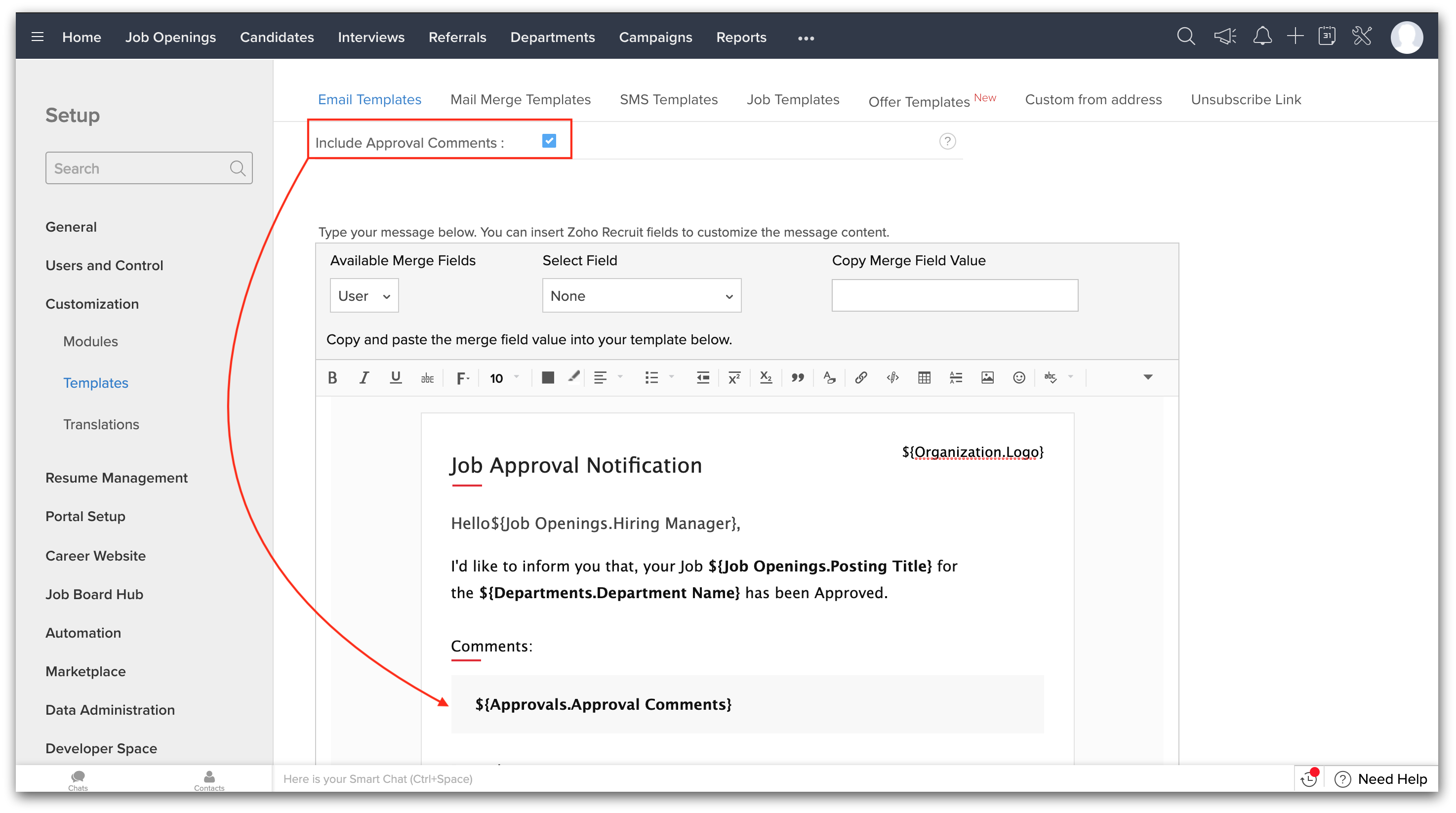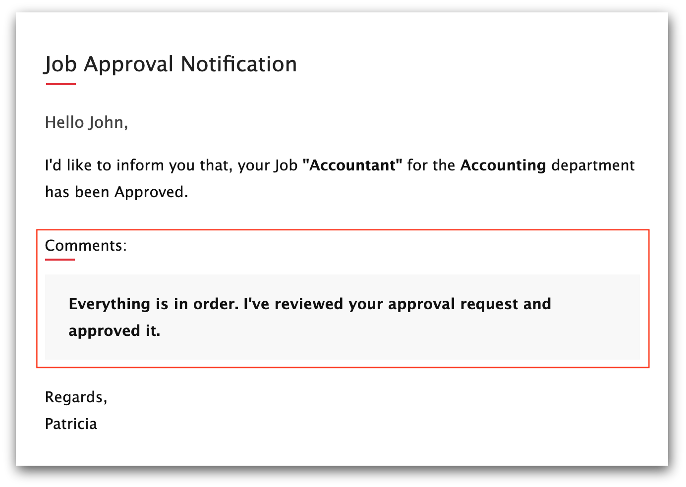 You can choose to include the comments provided during the approval process to the email by using the Include Approval Comments checkbox while editing the email template.