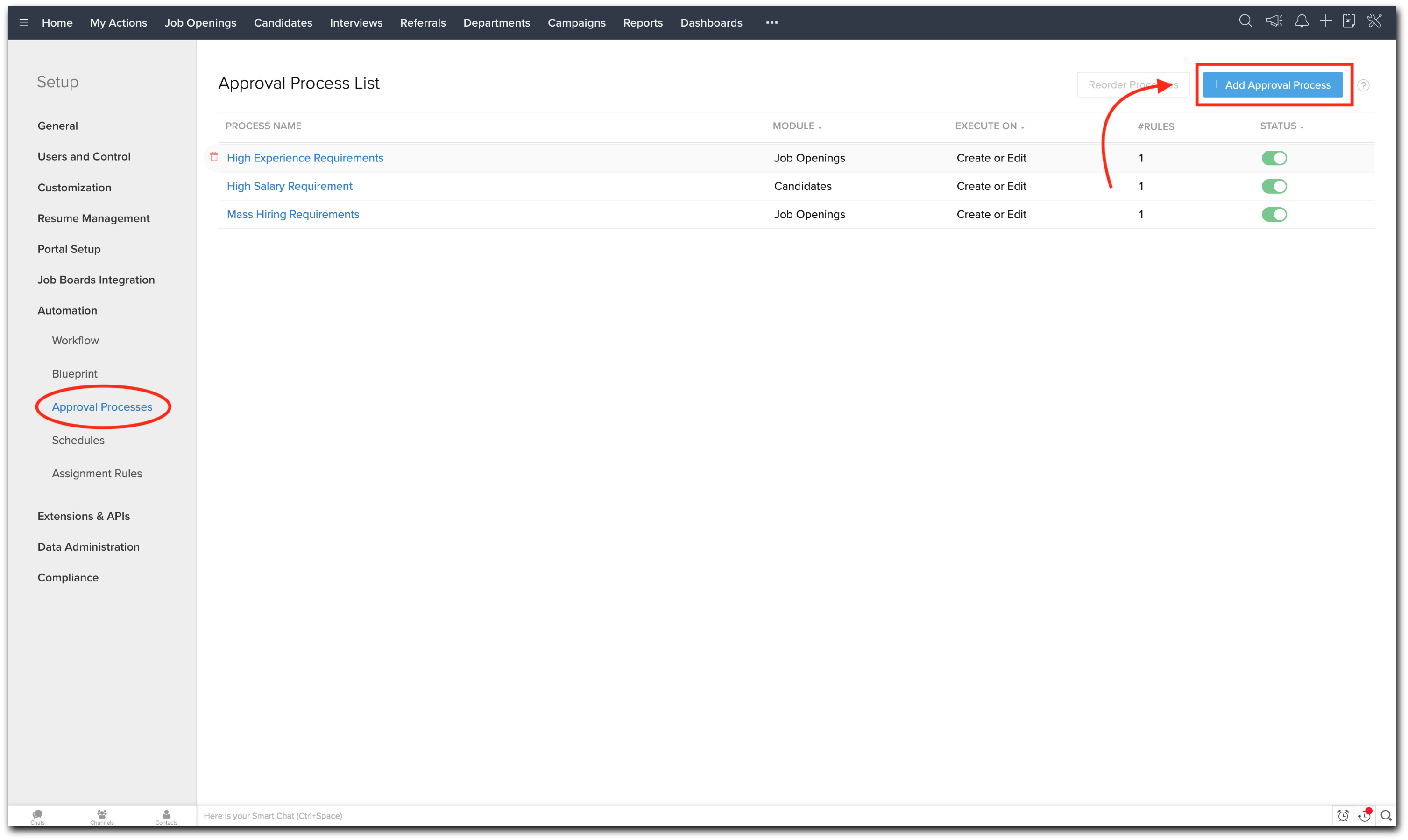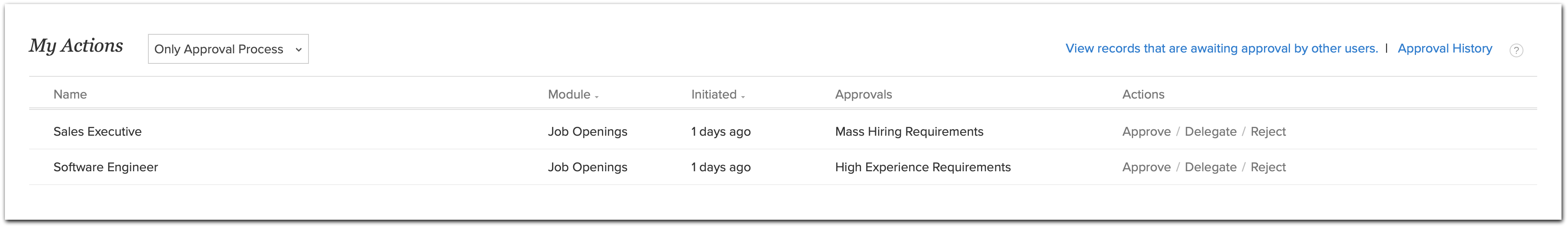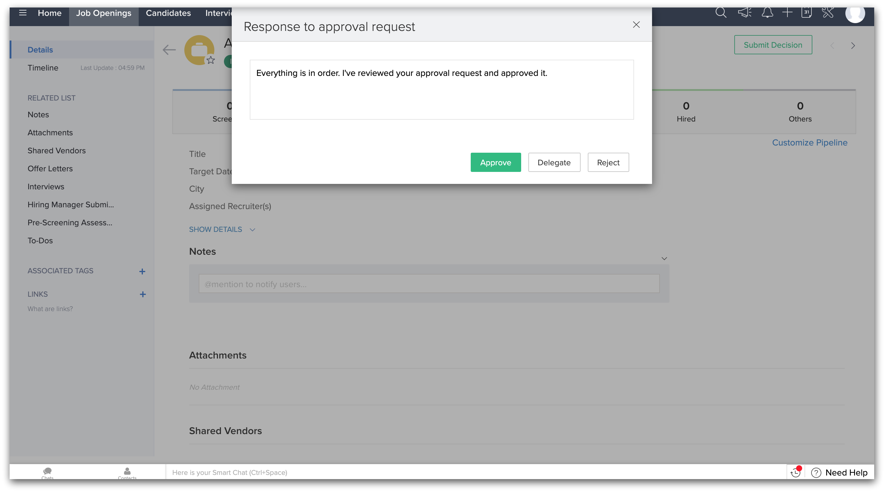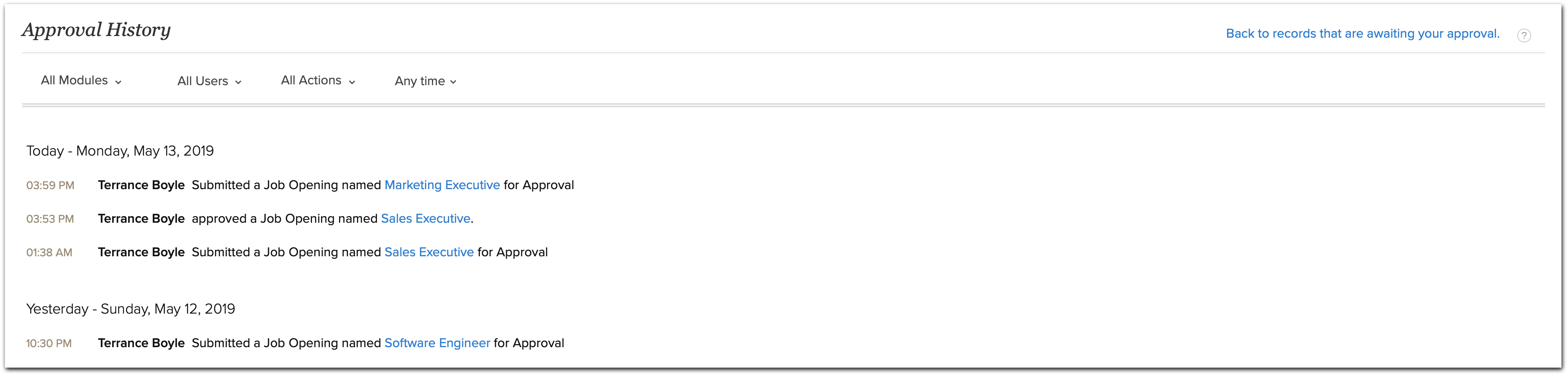 Zoho Recruit’s Approval Process feature makes this easier by automating these monotonous tasks.