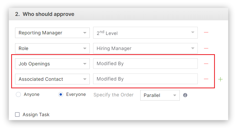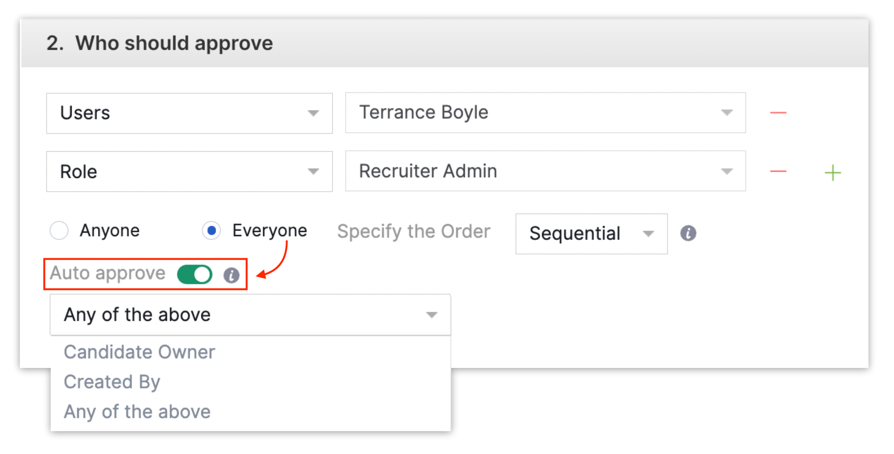 - Click on the Add icon to include more users who need to approve. On adding more than one entry for approval, you will get the following options: