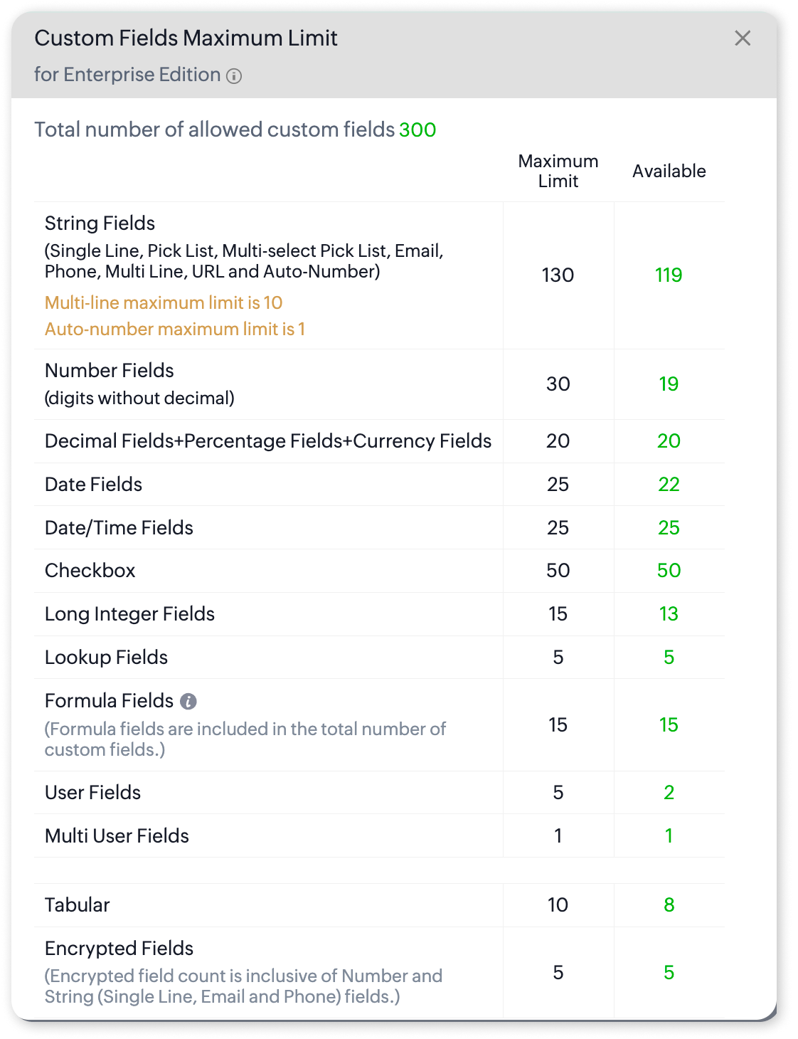 - The maximum number of fields that you can create depends on your Edition. There is also a limit for how many of each type of field you create.