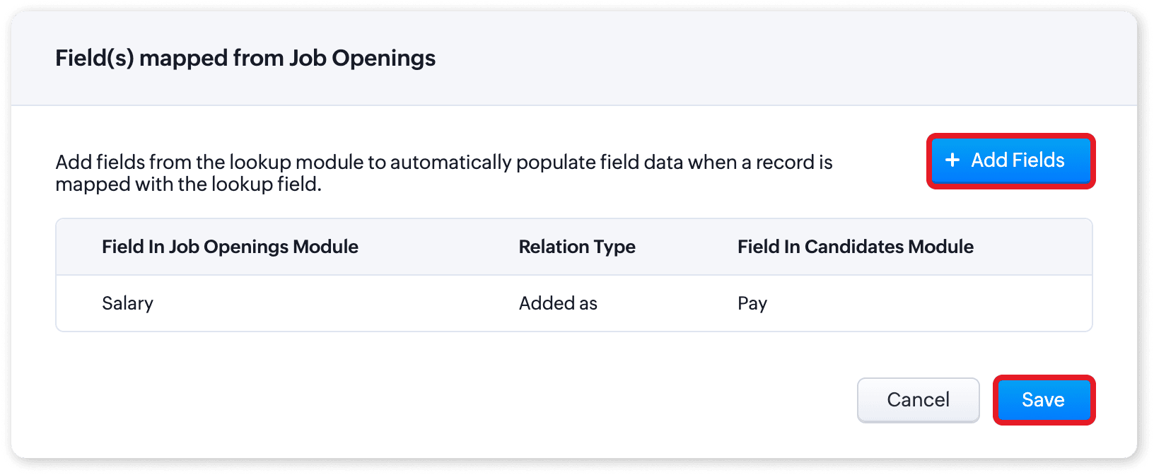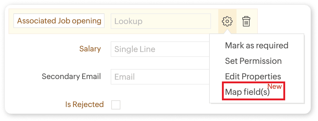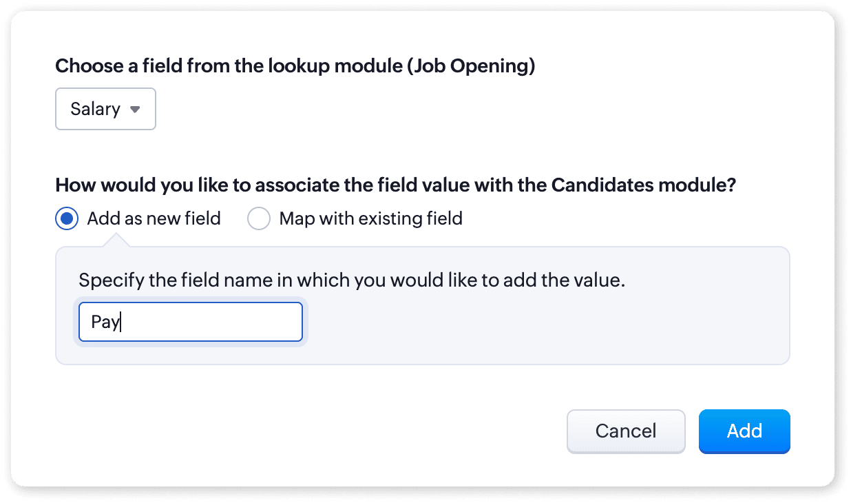 - Choose the method to relate the fields: Once you've identified and selected the fields from the lookup module to associate, decide whether to map them with existing fields in the primary module, such as job type, or add them as new fields, like job location or hiring manager.