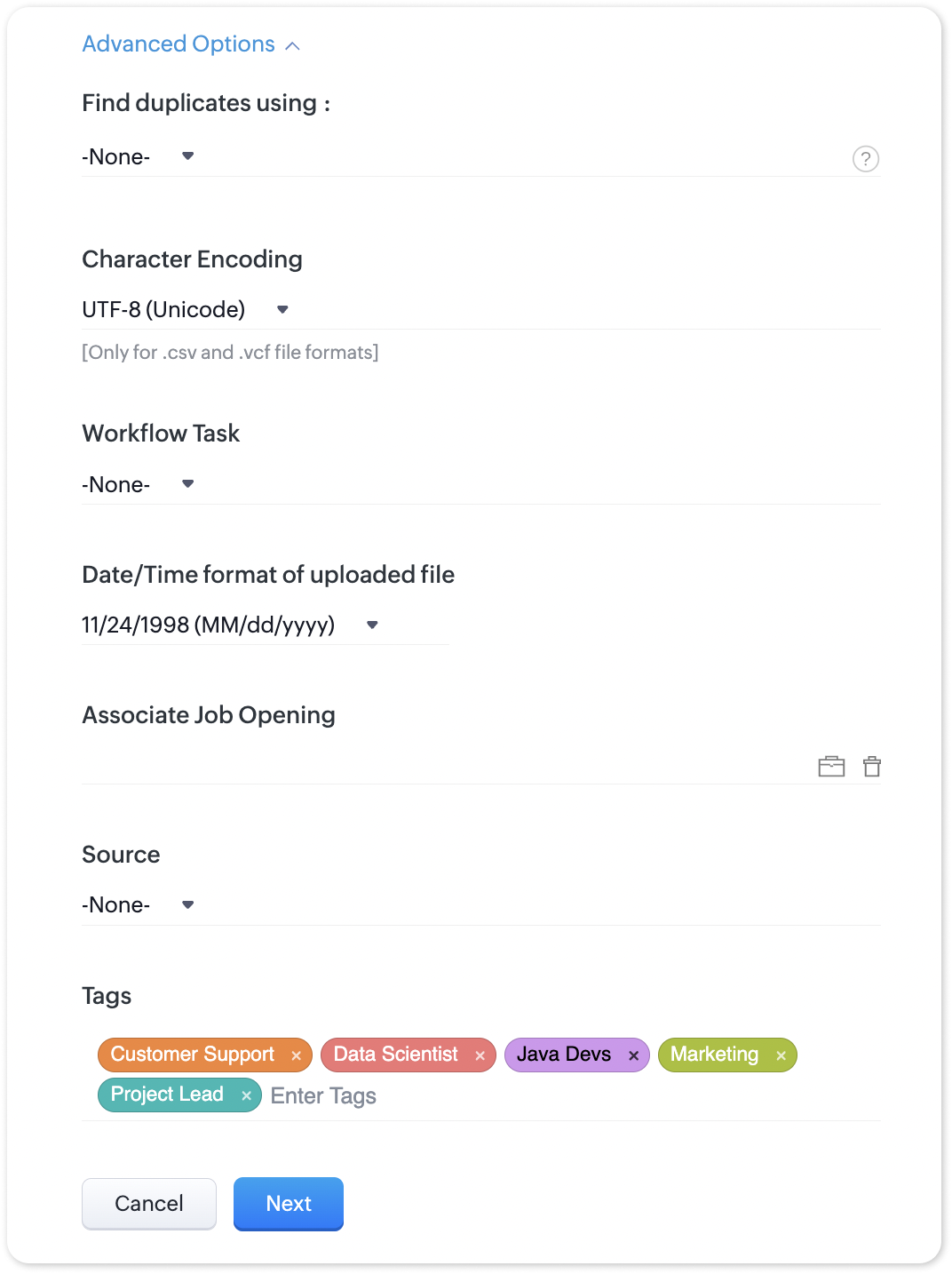 Add tags while you import records into your Recruit account.For example, if you have a CSV file with a few Candidates data containing a tag Event Candidates, then you can map the tags directly while importing. In other cases, where the Candidates data have different tags and you can add a default tag Event Candidates to them.