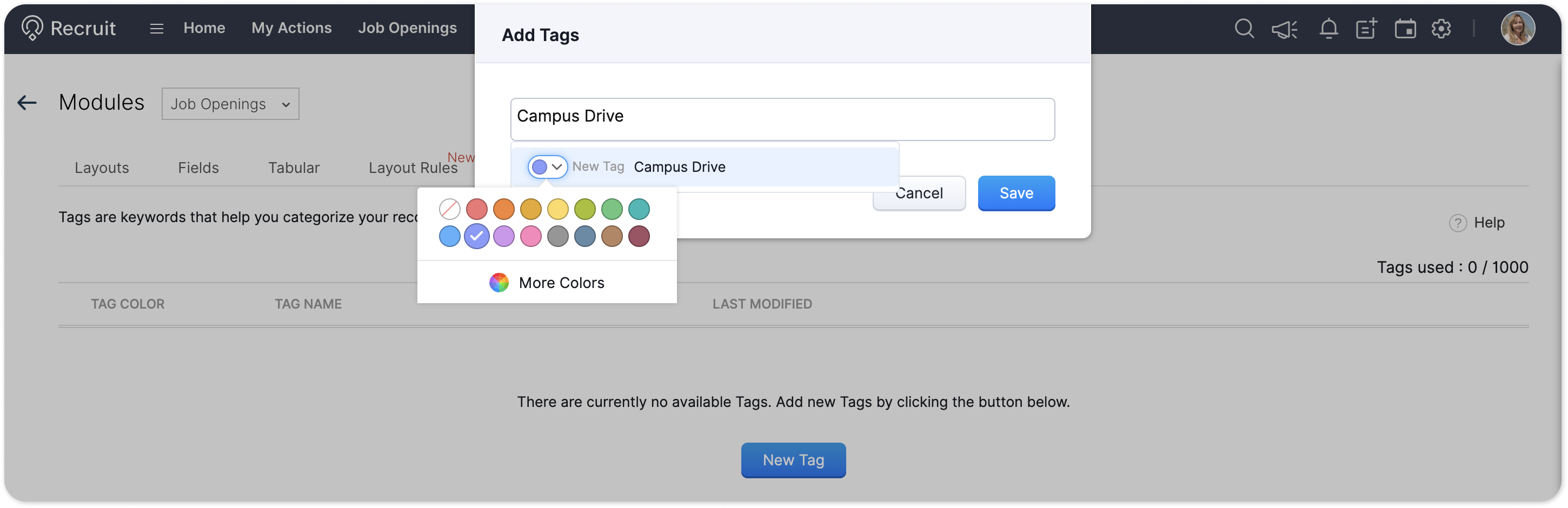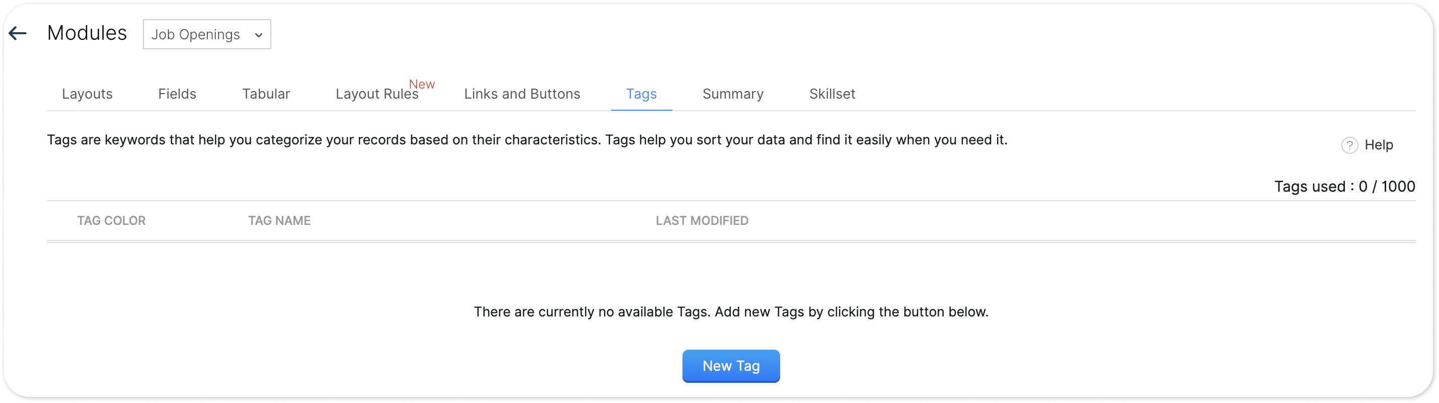 - Choose the module (such as Candidates, or Job Openings), where you want to add tags.