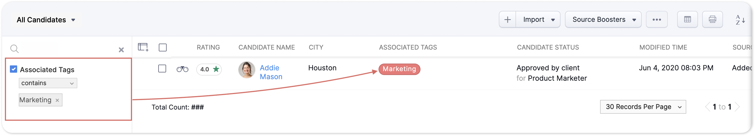 Zoho Recruit allows you to filter records using tags added to them. When you select a tag from the filter, only records with that tag will be listed. From the above example, if you want to filter candidate records as per the tag name: Marketing, follow the steps given below: