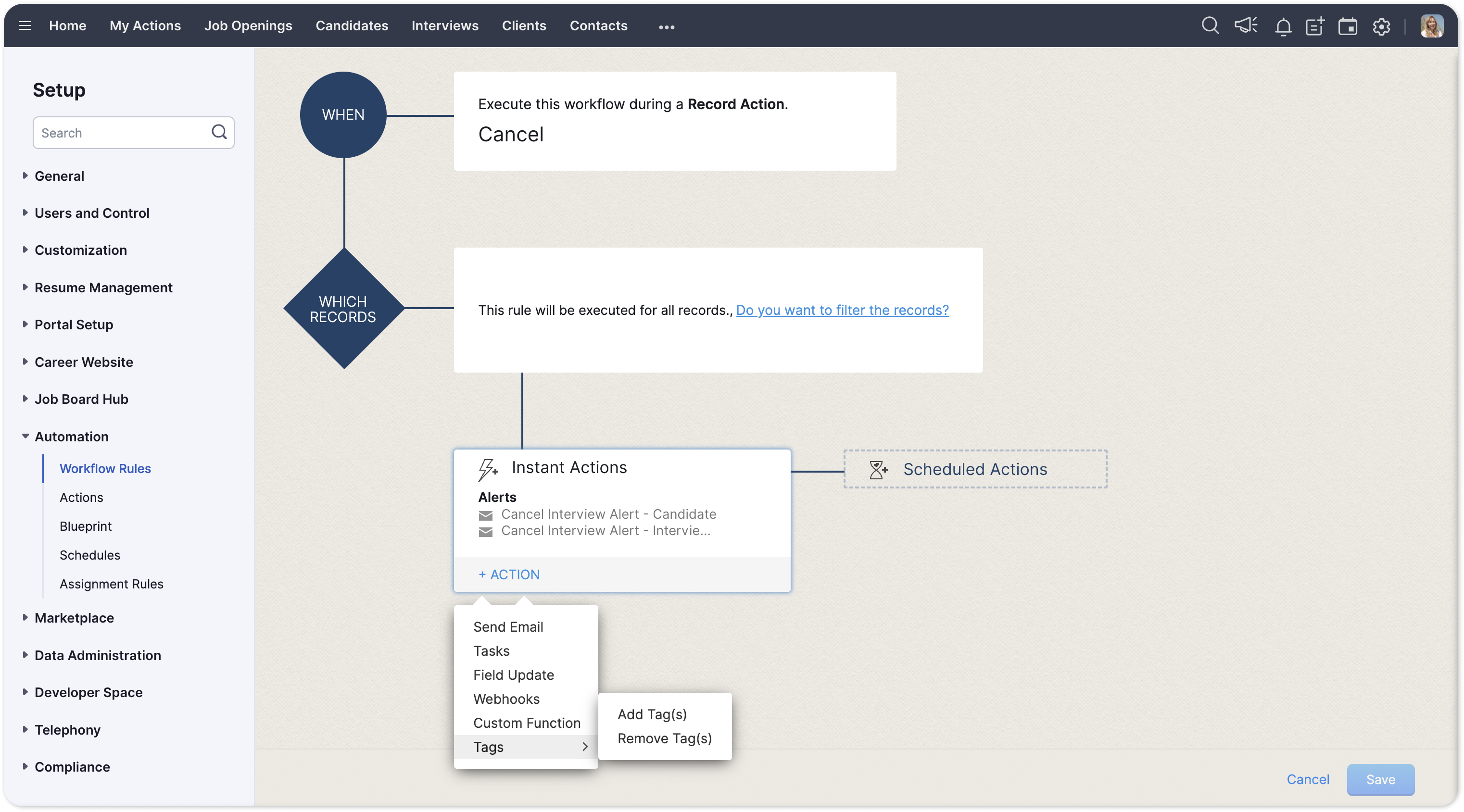 In Zoho Recruit, Workflow Rules are a set of actions such as alerts, tasks and field updates, which will be executed when certain specific conditions are met.