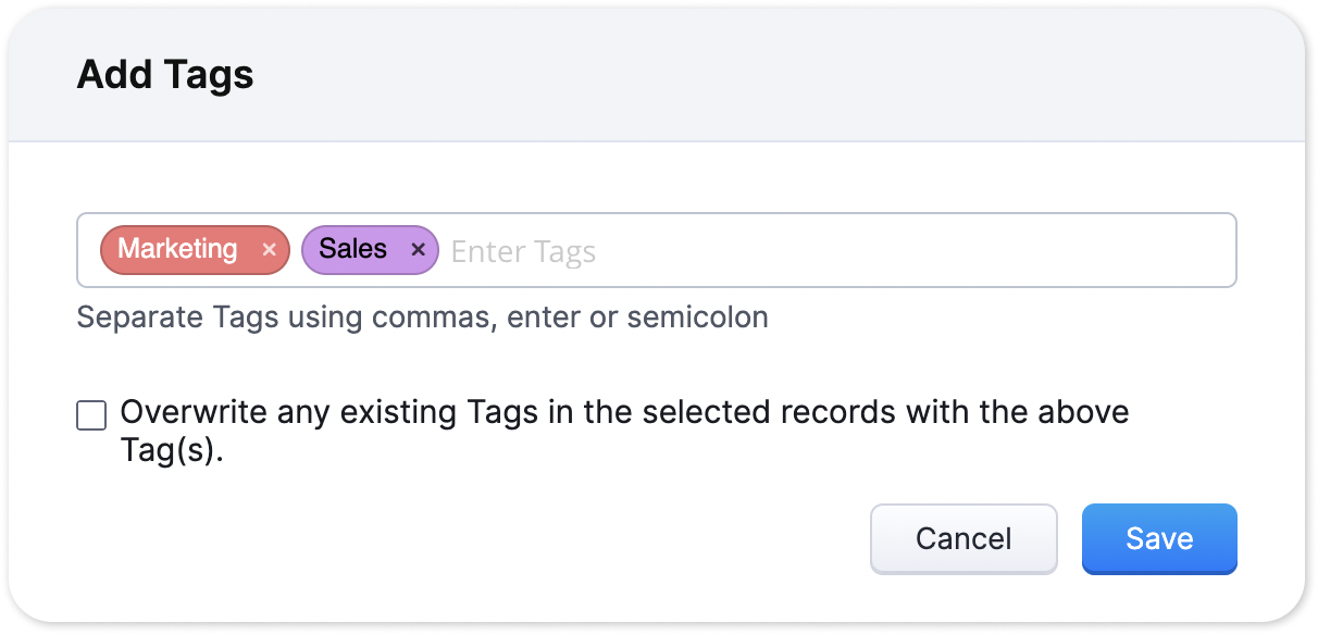 If there are few existing tags and are not relevant to that particular action, you can overwrite them with new tags, if necessary. Overwriting tags will replace all the existing tags with the newly updated tags. Also, you can overwrite tags only while adding them via blueprint, workflows and to multiple records.