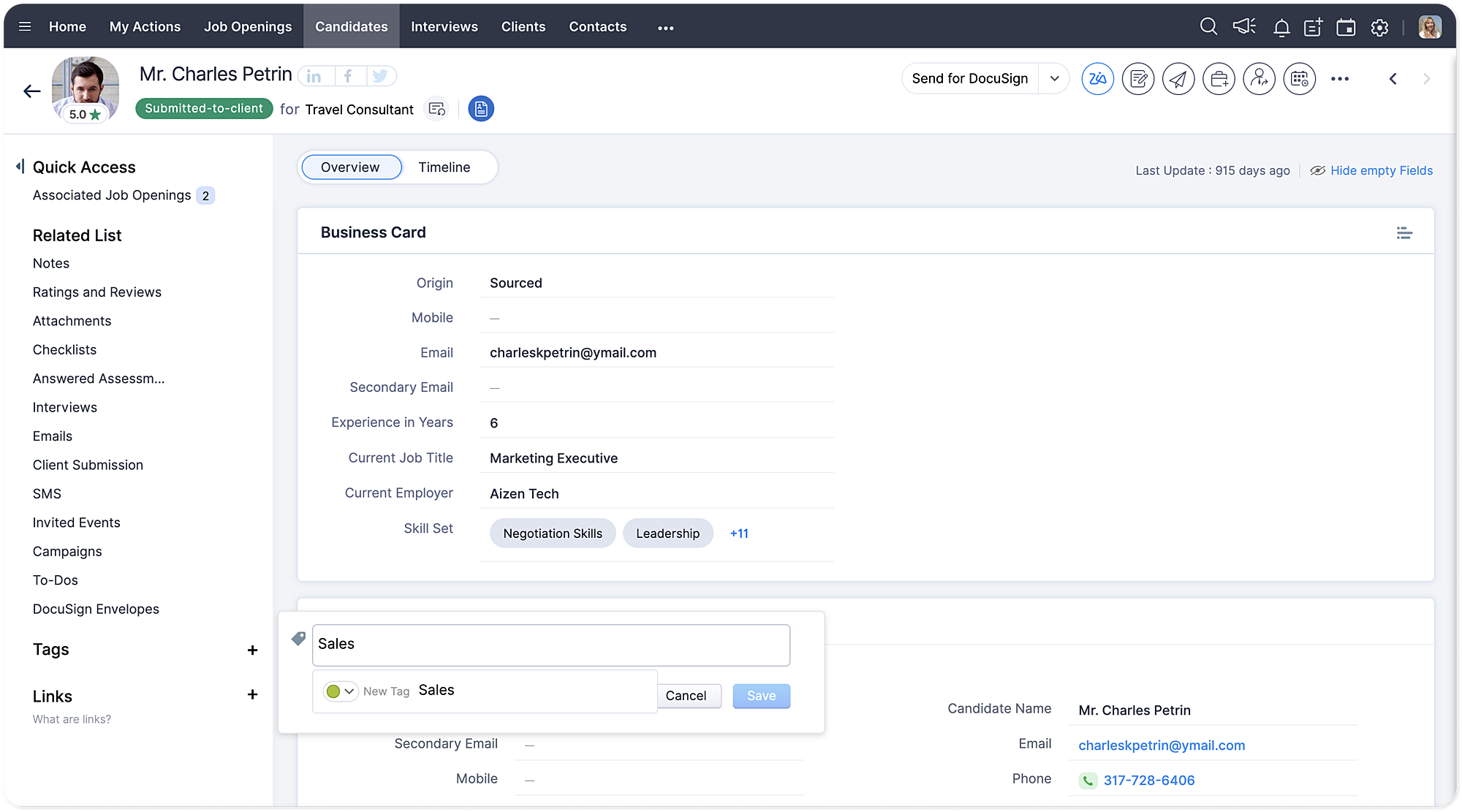 You can remove a tag from a record any time. From the above example, to remove Marketing tag from the candidate record follow the steps: