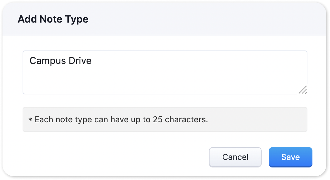 Note: By default, Admin and Standard users have permission to create and edit a note type. But only admins have the permission to delete a note type.