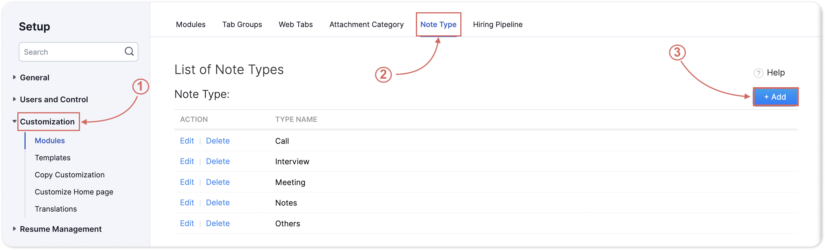 1. Click Setup > Customization > Note Type.