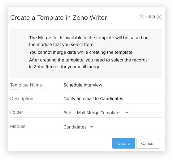 For example, you may have to send personalized letters to candidates or create templates for service level agreements or other legal documents. In these cases, you do not need to manually type the details of each lead to personalize the letters or agreements. Instead, you can create a template with the merge fields from the Candidates module and merge the data to get all the personalized letters.