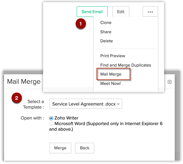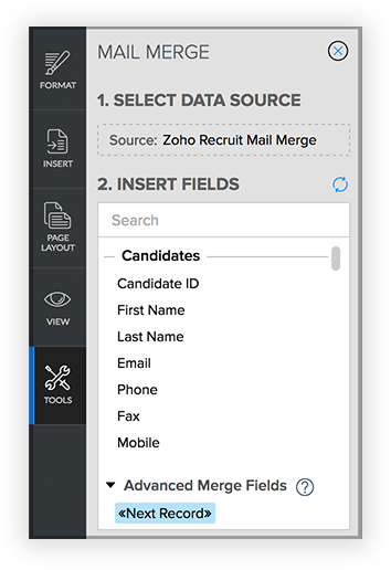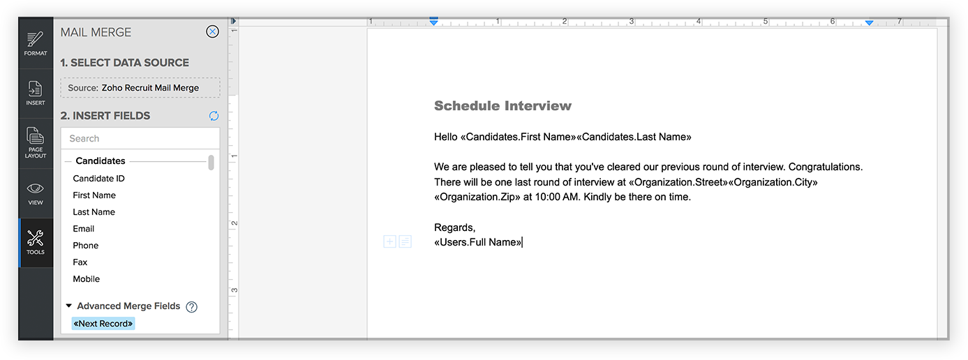 Mail merge is a function that helps simplify repetitive tasks to create personalized documents (including forms, letters, address labels, and envelopes). You can create a mail merge template containing variables (merge fields) and use it to merge data from Zoho Recruit and create merged documents the values for the variables automatically inserted.