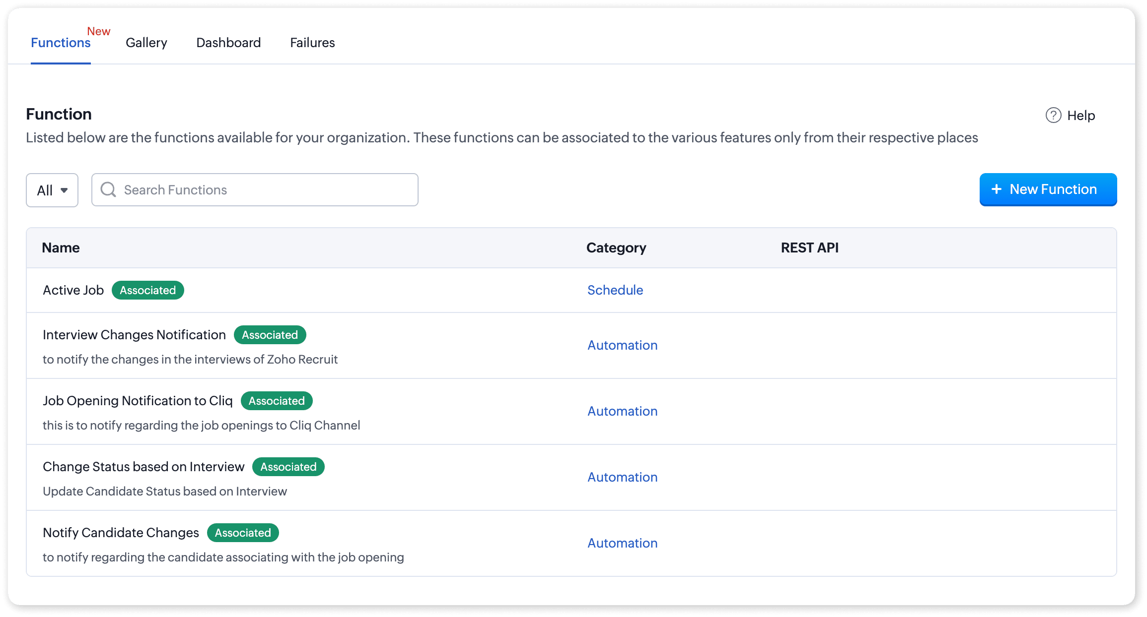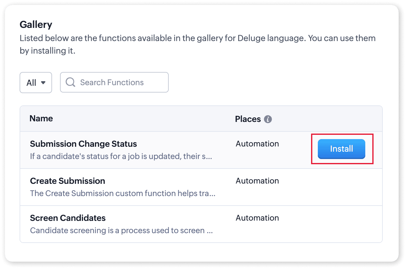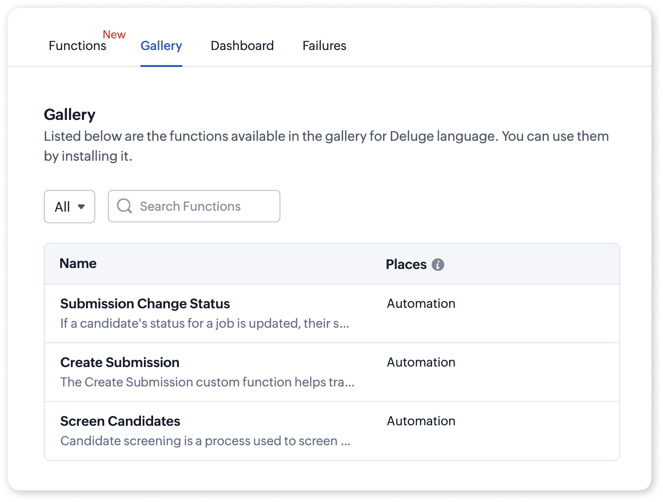 The Gallery section is a comprehensive repository offering a diverse collection of pre-built custom functions. Accessible within the platform, this gallery empowers users to enhance their recruitment processes by implementing tailored functionalities without extensive coding knowledge. Whether seeking to automate candidate screening, streamline interview scheduling, or analyse data more efficiently, users can explore, select, and deploy custom functions from this centralised hub, augmenting the capabilities of their Zoho Recruit experience.
