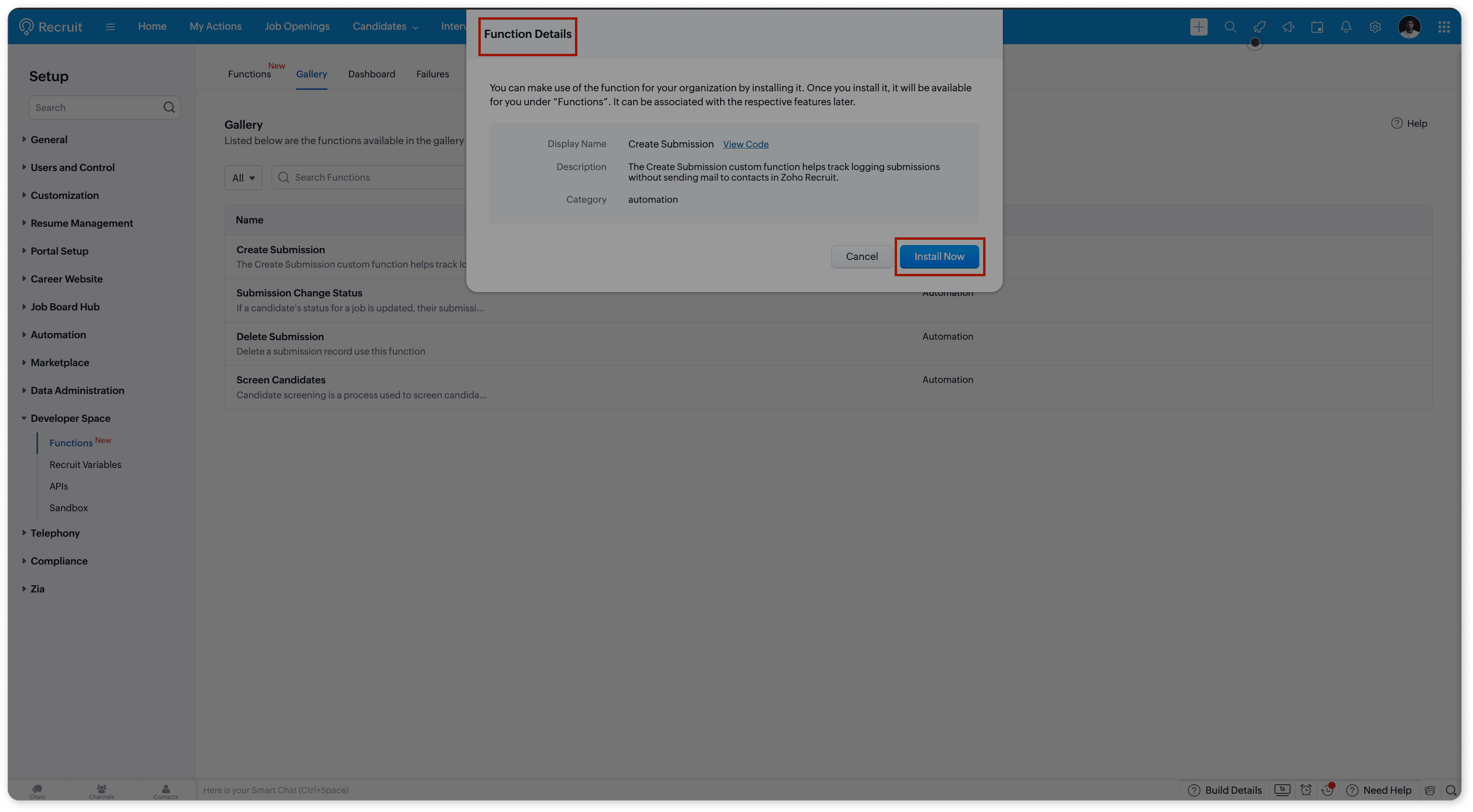 - Navigate to Setup > Functions (under developer space) > Gallery > Install the custom function Create Submission