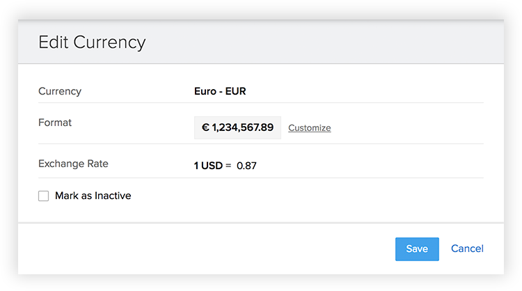 The exchange rate is specified while adding multiple currencies. Each record will have the Zoho defined field named Exchange Rate with the conversion value based on the record currency. This is added to keep a note of the rate of conversion at the time of record creation. When the multi-currency feature is activated, the home currency will be set as the record currency for all the existing records. As a result, the exchange rates for the existing records will be set as 1.