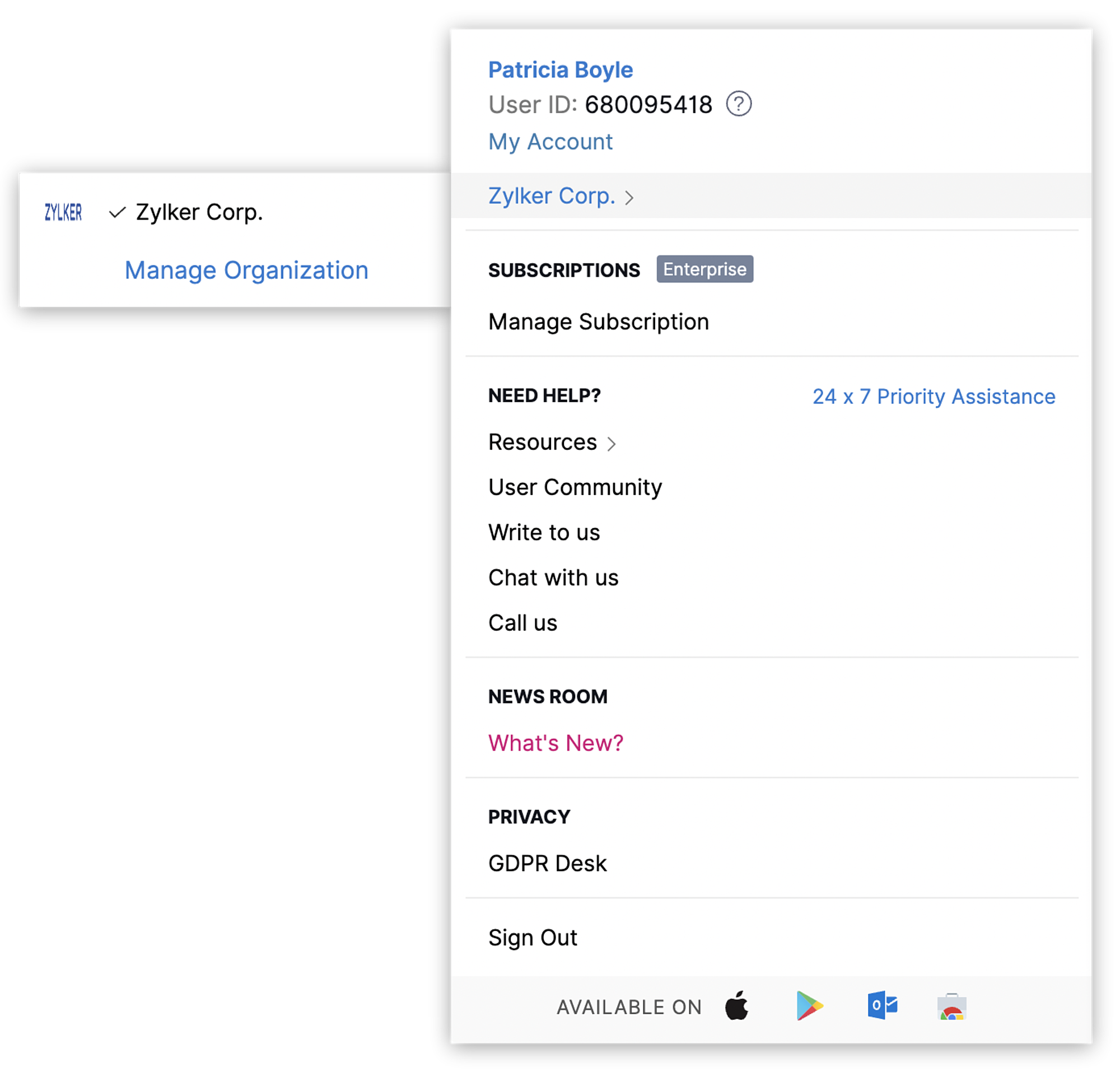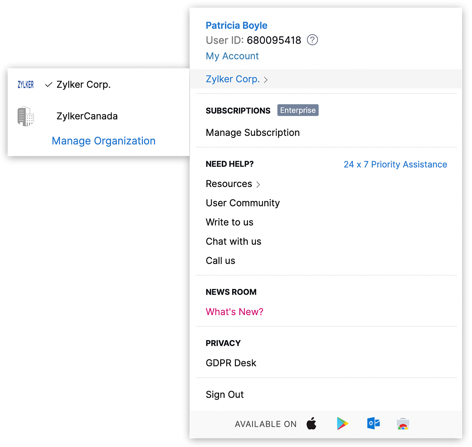 To create multiple org accounts, a user must be an admin or super admin in one of the accounts. For example, if John is a standard profile user for Zylker US and an admin for Zylker Canada, he will be allowed to create accounts. However, if he has a standard profile in both the orgs, he will be restricted from creating a new account.
