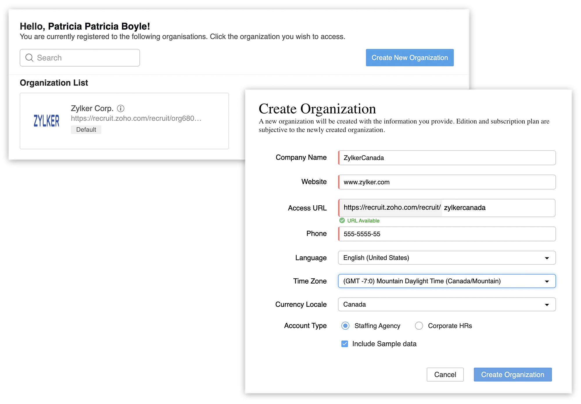 This will populate some sample data in this new organizational account for you to work with and explore the features Zoho Recruit has to offer. - Click Create Organization.