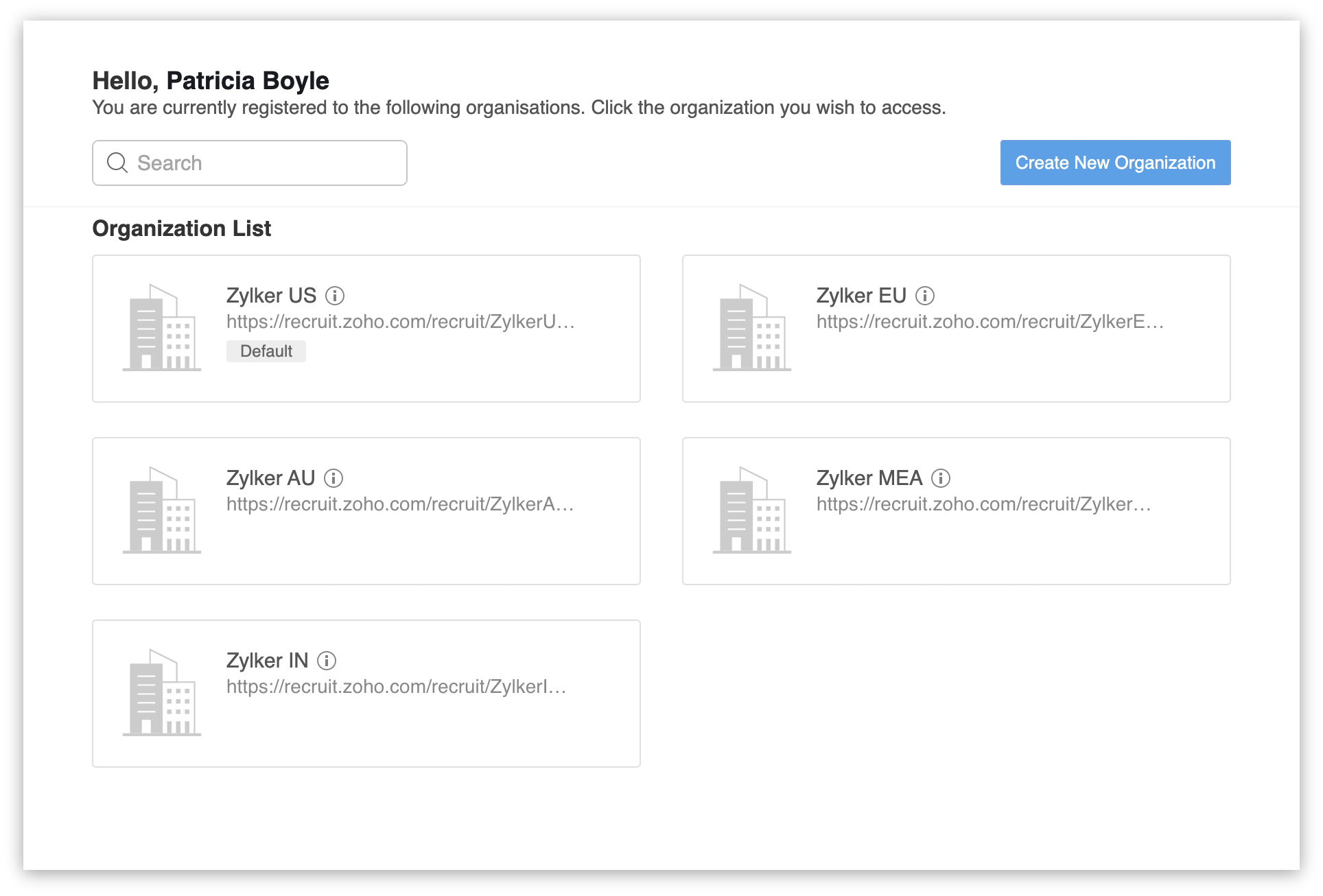 Zoho Recruit allows users to access multiple organizational accounts using the same email address. This is especially useful for organizations who maintain different accounts to manage their hiring across various regions.