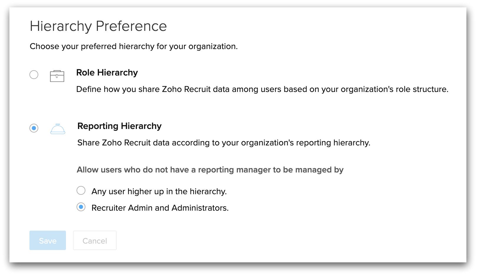 In Zoho Recruit's Reporting Hierarchy, you can set up the organization's hierarchy structure based on the roles and also assign reporting managers to users for well-defined record accessibility. In this hierarchy structure, a user is assigned a reporting manager who is entitled to view or access the user's data. Only members of the organization with equal or greater roles than the user can be made their reporting managers. Also, you can choose if the non-reporting members of your organization are managed by any superior at a higher role or by Super admin and Admin. This structure ensures controlled access of information within the organization and also ascertains that a user has only one reporting manager.