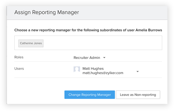 Zoho Recruit lets you view a user's reporting details at one click. The user information will display a user's reporting manager as well as subordinates (if applicable). This data will not be visible if the hierarchy preference is changed or disabled. However, a non-reporting user's data will not be displayed.