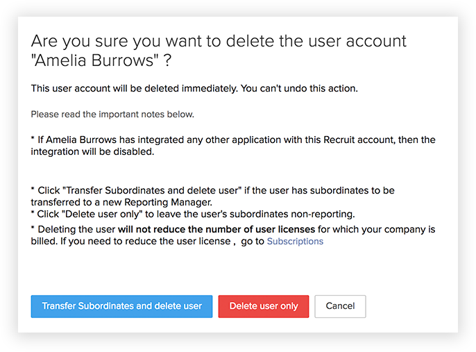 As an admin, you can delete users from your org's Recruit account. There are two conditions you need to make a note of while deleting a user: