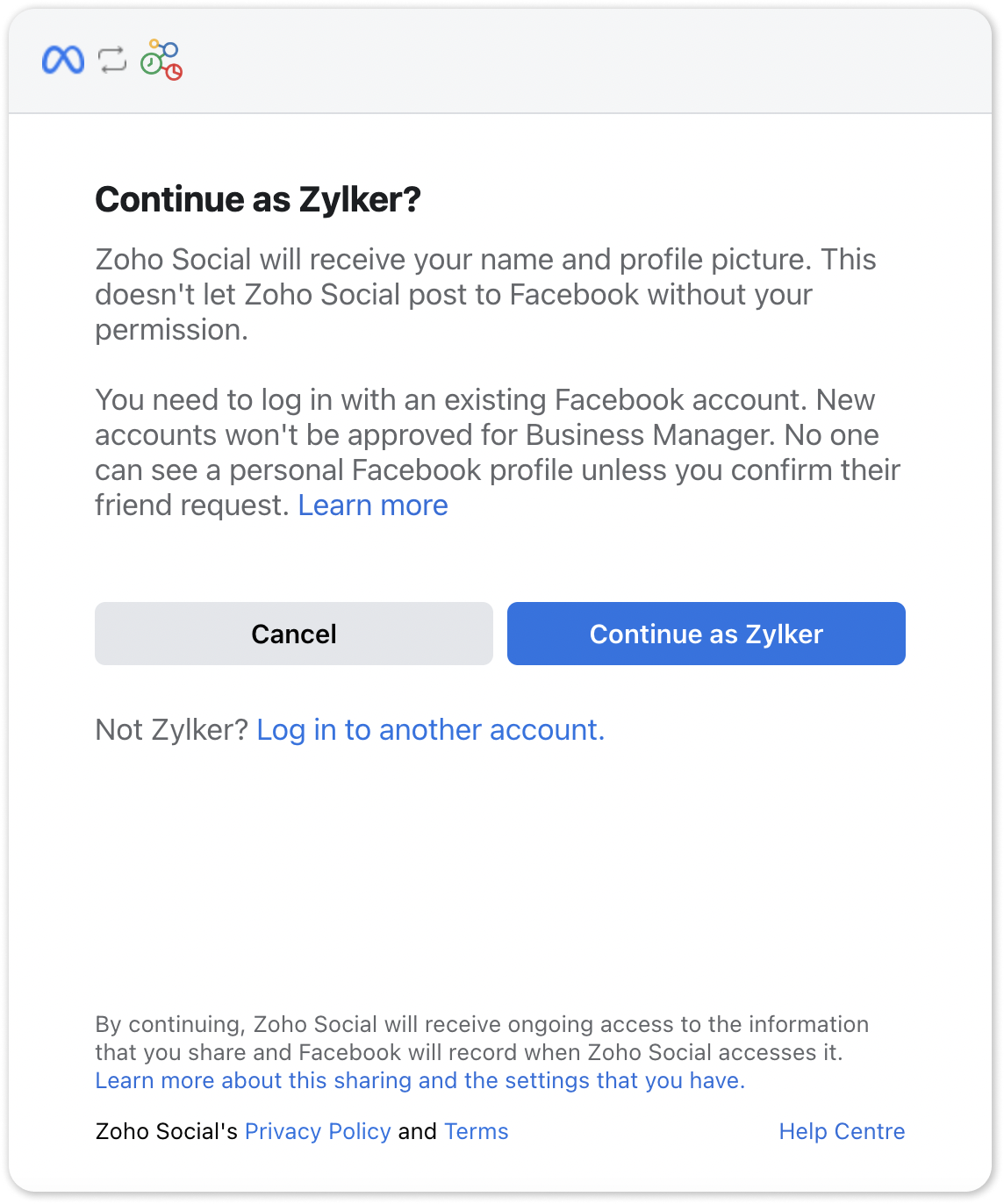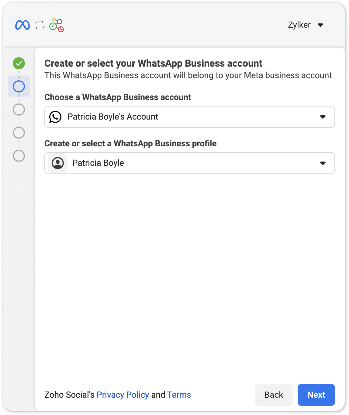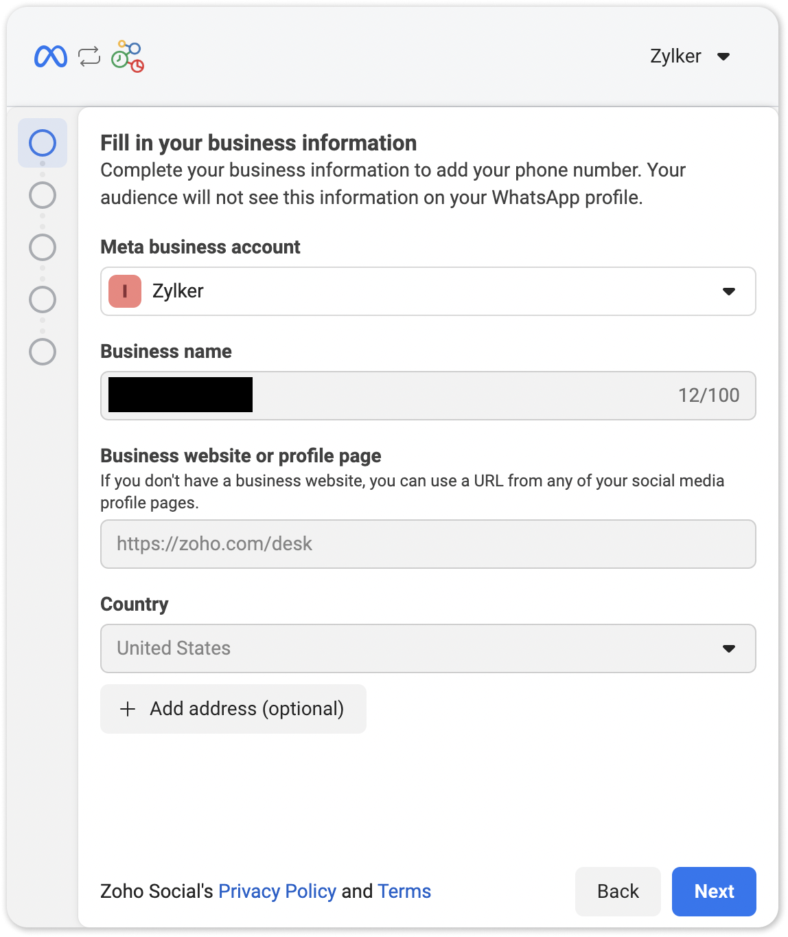 - Select your Meta business account and fill-in your business details. Click Next when you're done.