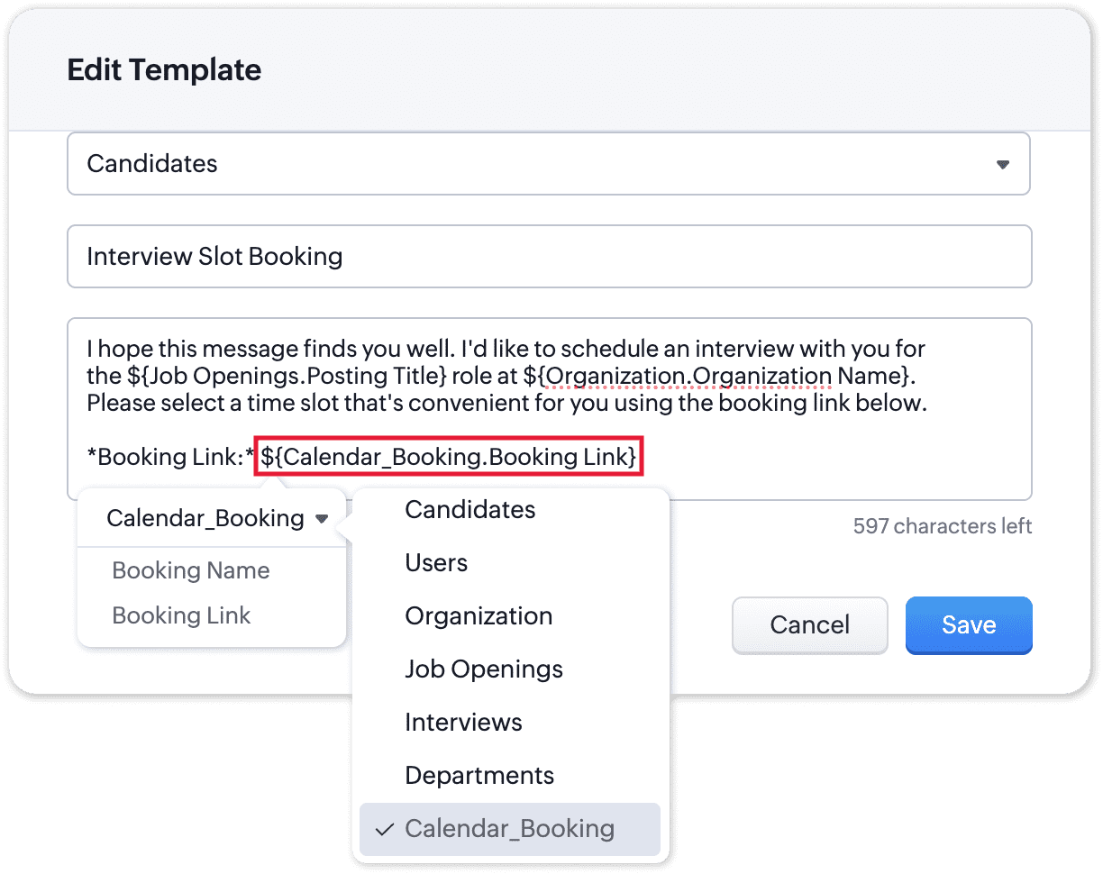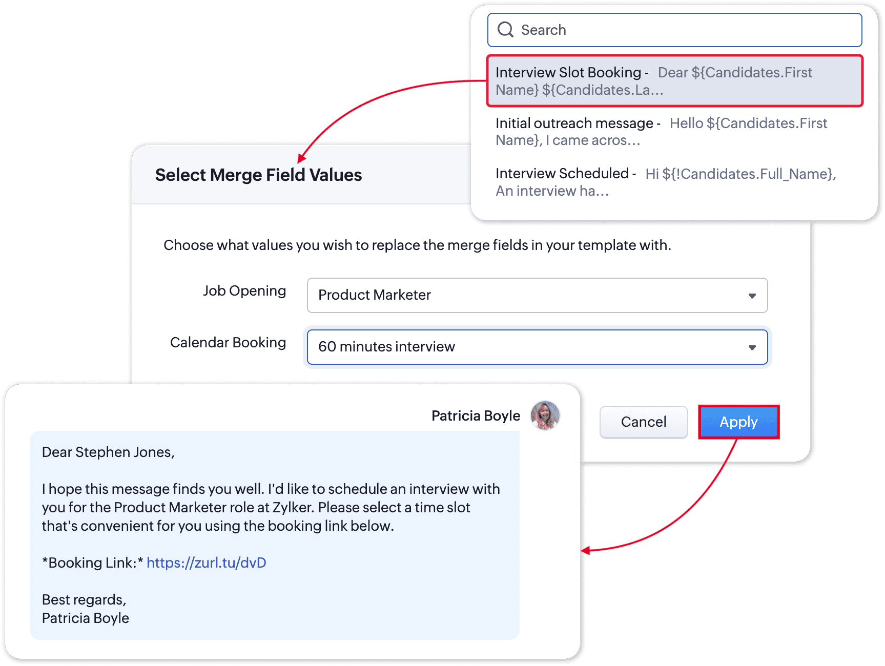 Upon choosing the template to send a WhatsApp message, merge fields will automatically be replaced with values from the Candidate/Interview record. However, merge fields such as Job Openings, Calendar Booking & Interviews might have multiple values for one candidate. You will have to select these manually from the Select Merge Field Values pop-up.