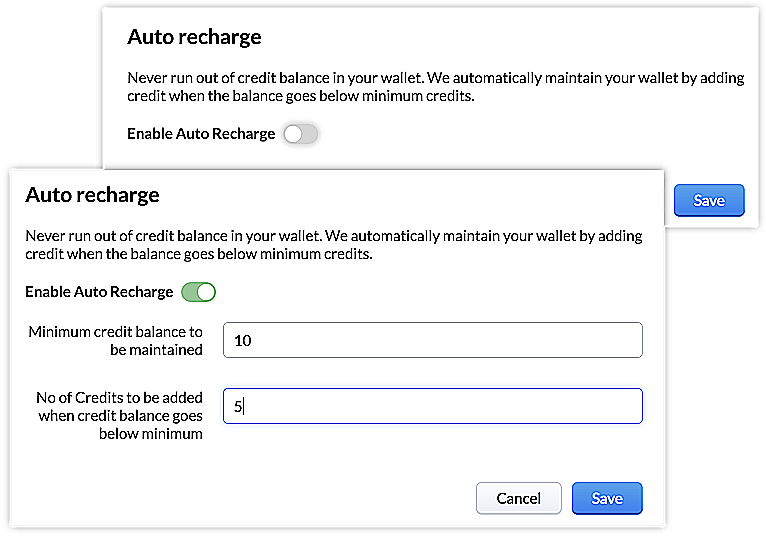 - Auto-Recharge for Seamless Transactions: After your initial credit purchase, you can opt for our convenient auto-recharge feature. Set a minimum credit threshold to be maintained in your account. When your balance hits this limit, an automatic recharge occurs, ensuring you never run out of credits unexpectedly. You can also specify the number of credits to be purchased when your limit is exhausted, guaranteeing uninterrupted messaging services.