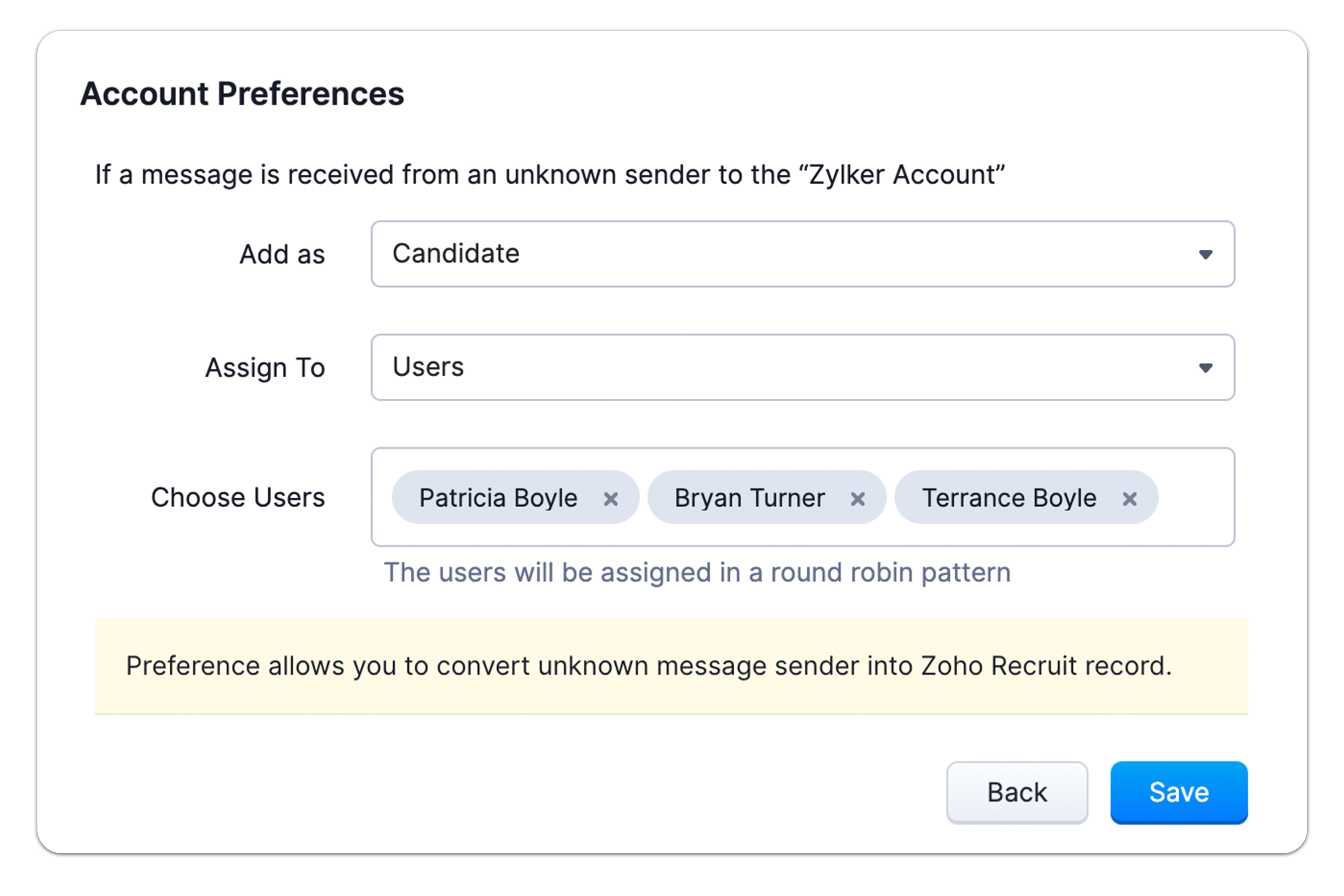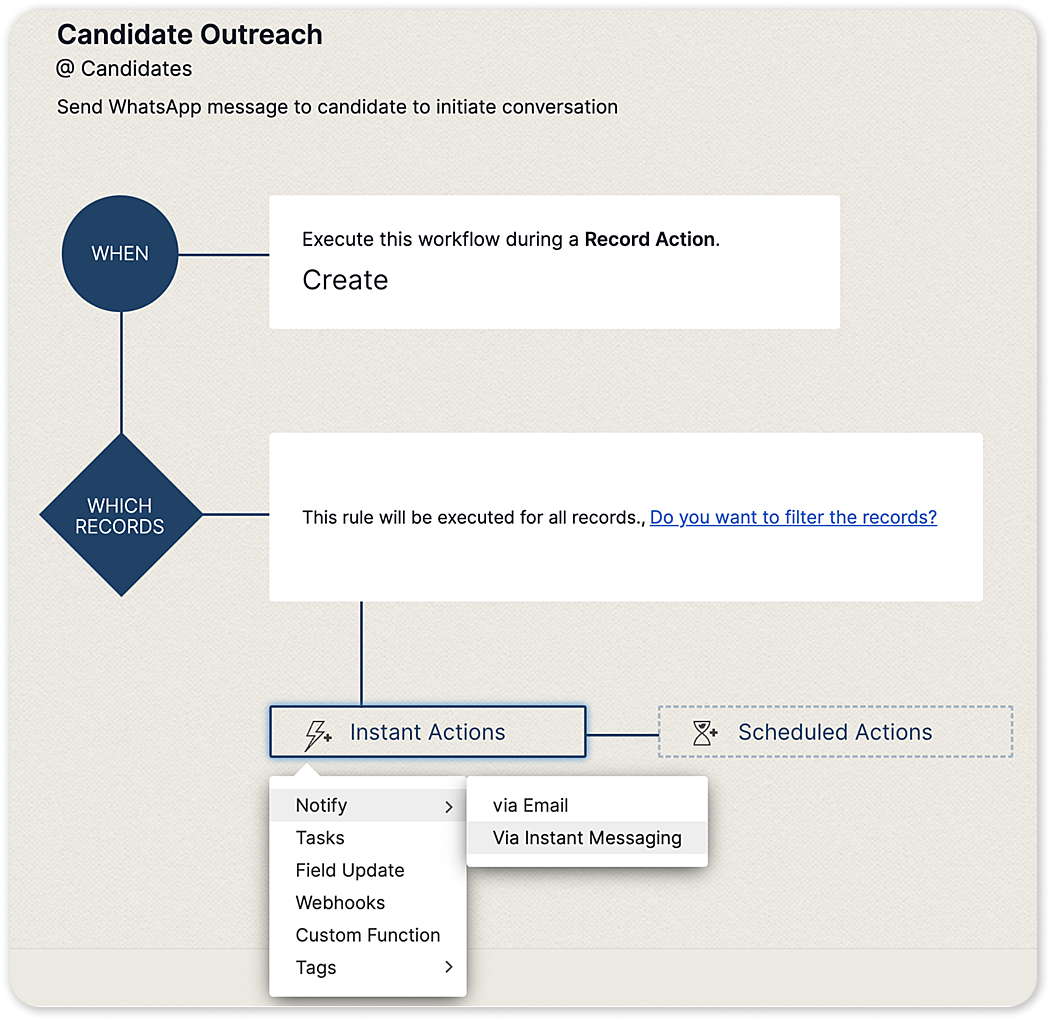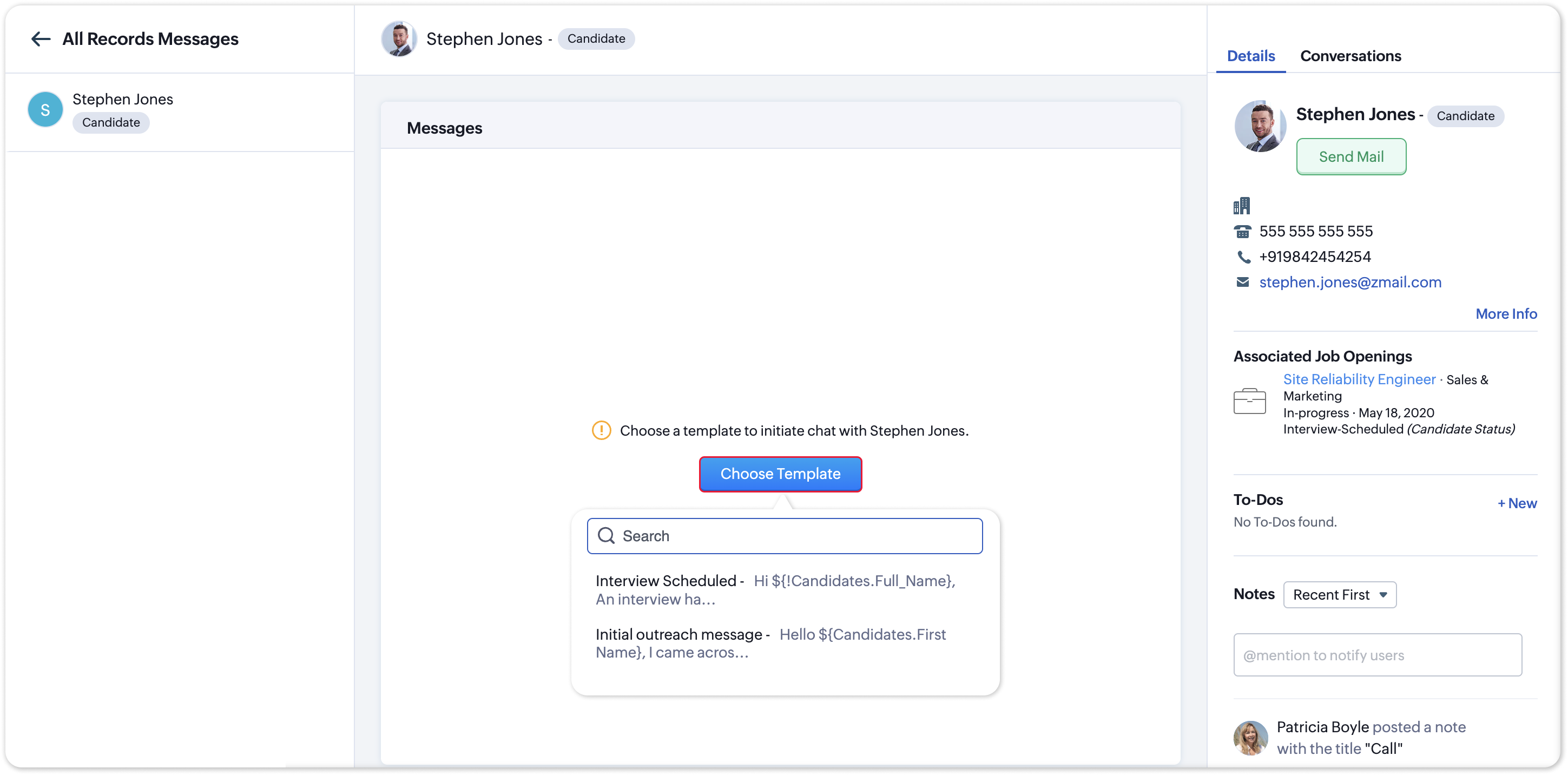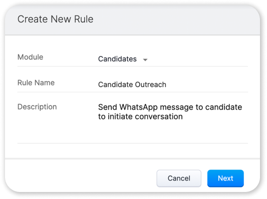 Using Zoho Recruit's Workflow Rules, conversations can be automatically initiated based on specific triggers and conditions. This method not only saves time but also ensures timely communication with candidates and contacts. Whether it's sending personalized messages, sharing important updates, or conducting follow-ups, Workflow Rules provide a seamless way to initiate conversations, enhancing engagement without manual intervention.