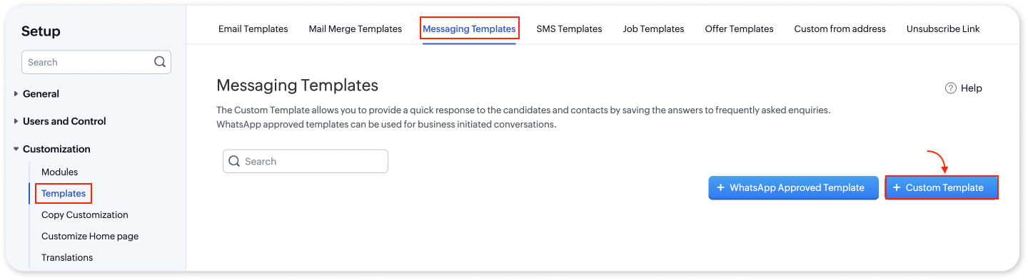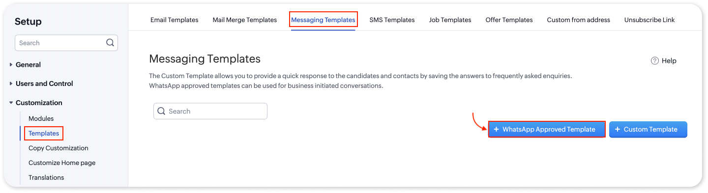 - Go to Setup > Customization > Templates > Messaging Templates and click Whatsapp Approved Template.
