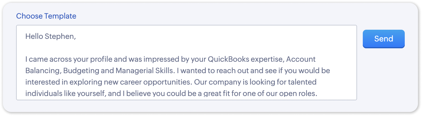 - Upon selecting a template, it will be displayed in a text box with all merge fields populated with details from the candidate/contact record. Verify your text and click Send.