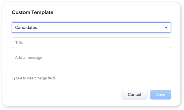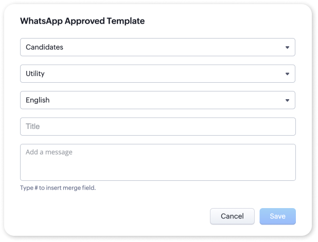 | These templates allow recruiters to create standardized messages with merge fields, such as the recipient's name, appointment details, or other personalized information. Custom Templates do not have to be approved by WhatsApp. |