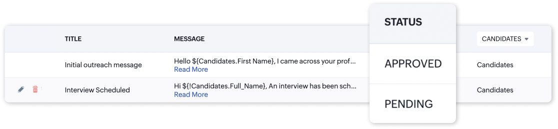 Upon creating one of these templates, they will be sent to WhatsApp for approval. If the template is approved, you can then use it to instantly message candidates and contacts on WhatsApp.