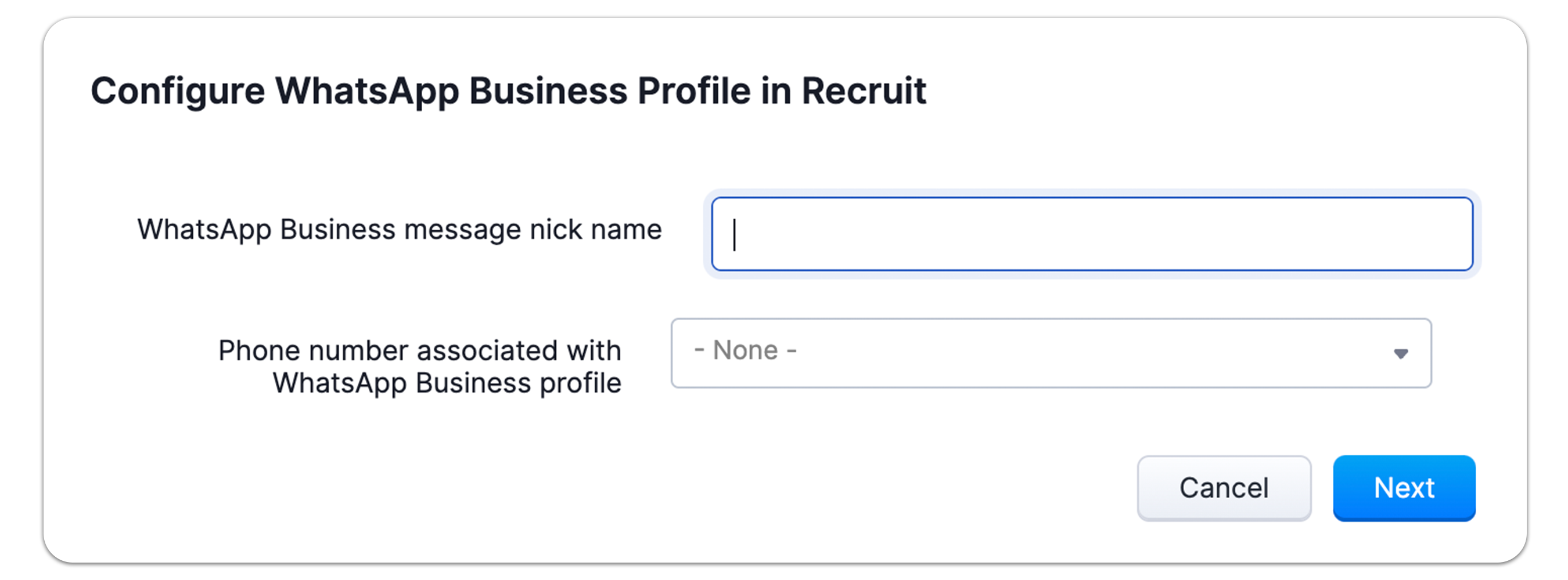 - In the Configure WhatsApp Business Profile in Recruit pop-up: