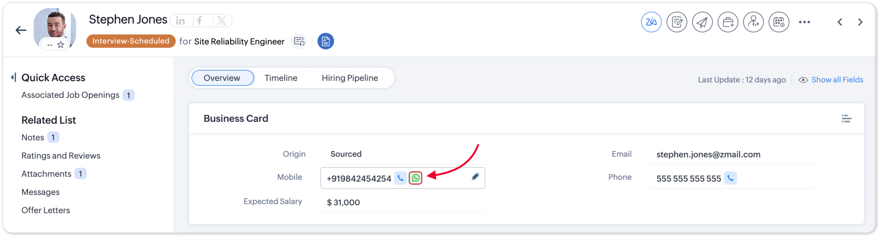 - Navigate to the record details page of the Candidate (or) Contact and click the WhatsApp icon located in the Mobile field.