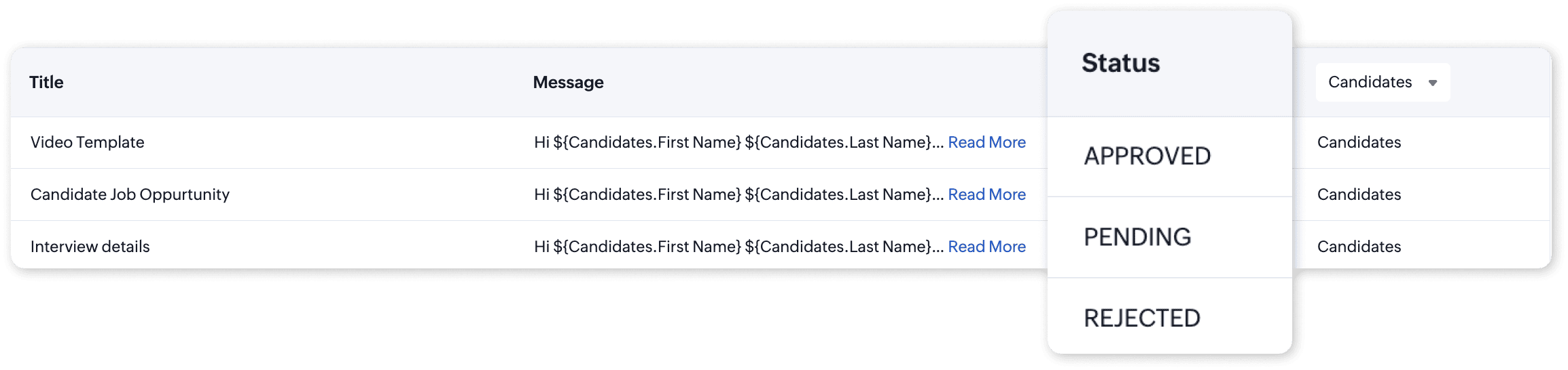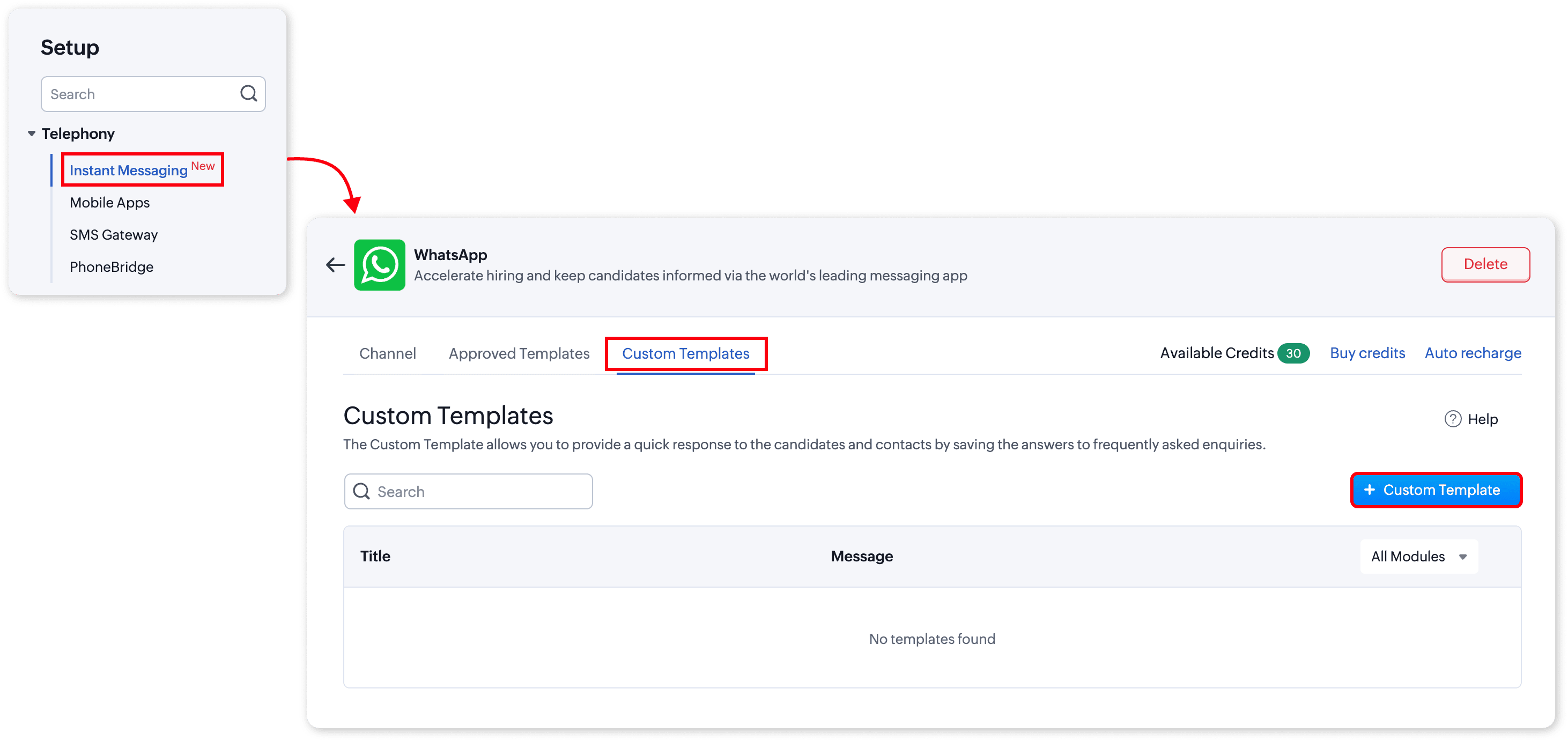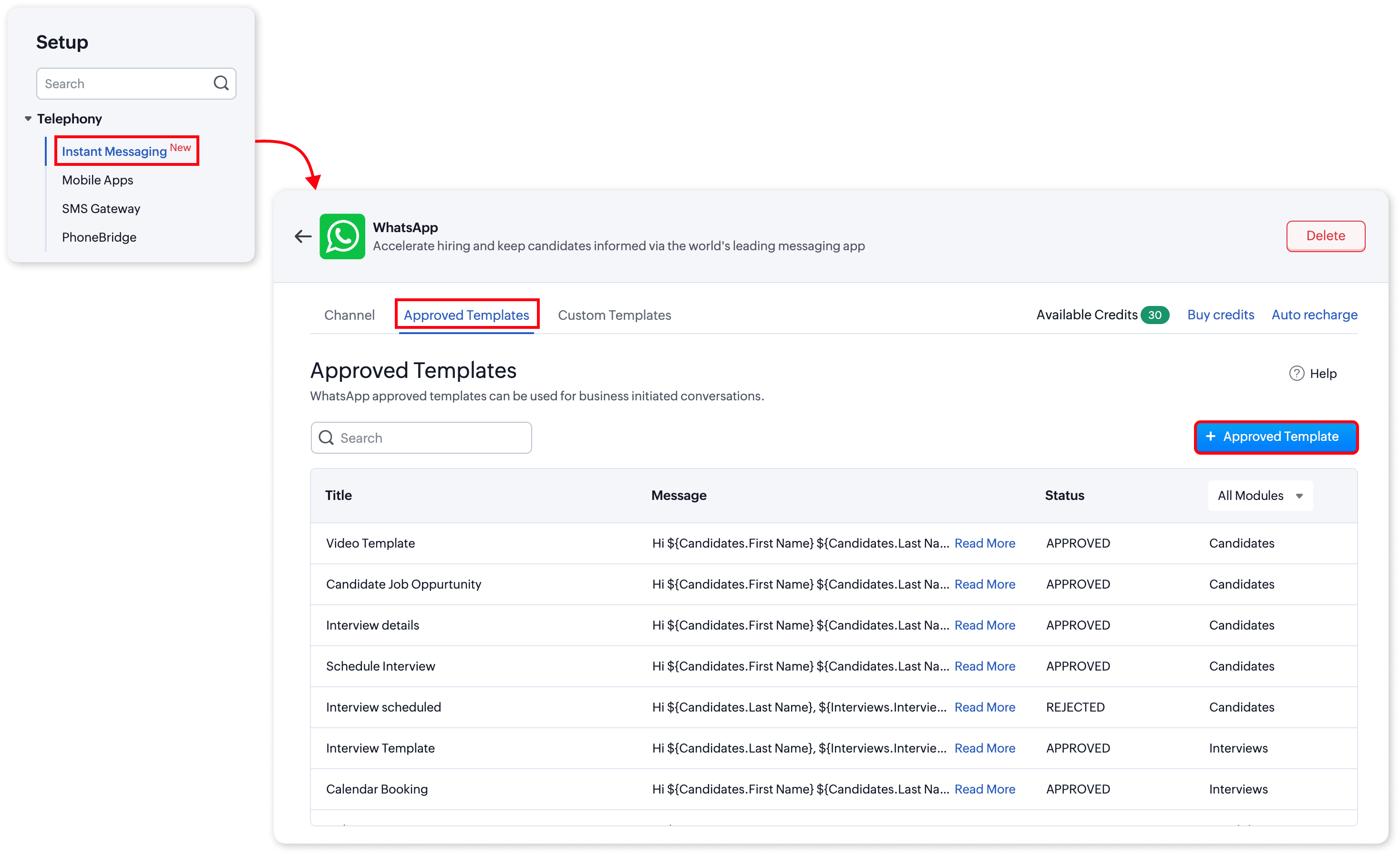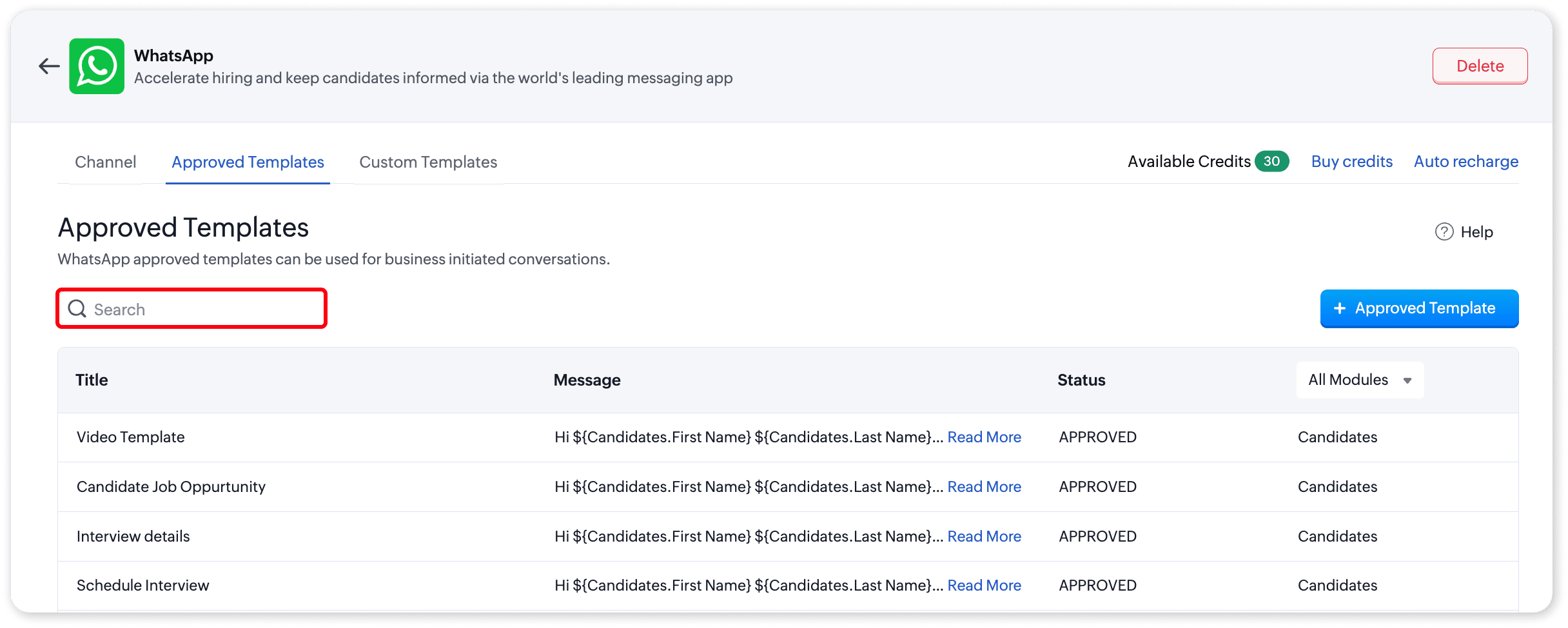 Zoho Recruit offers powerful messaging capabilities through two types of templates: Custom Templates and WhatsApp Approved Templates. These templates facilitate seamless, personalized communication with candidates, enhancing engagement and efficiency in the recruitment process.