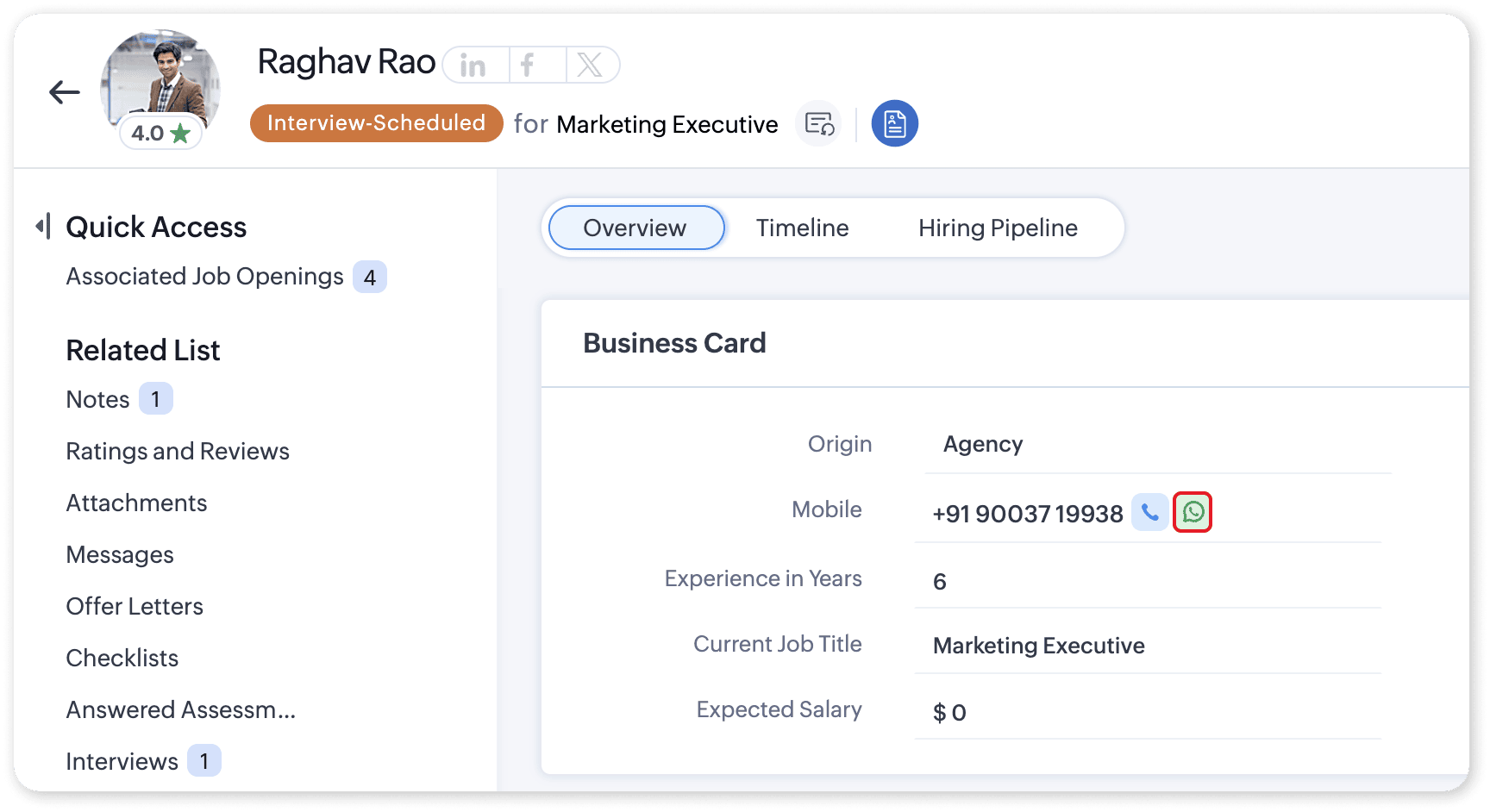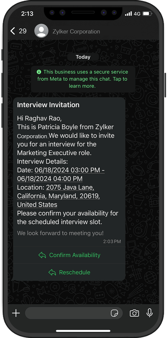 - Click Send to deliver the interactive template to the selected candidate via WhatsApp.