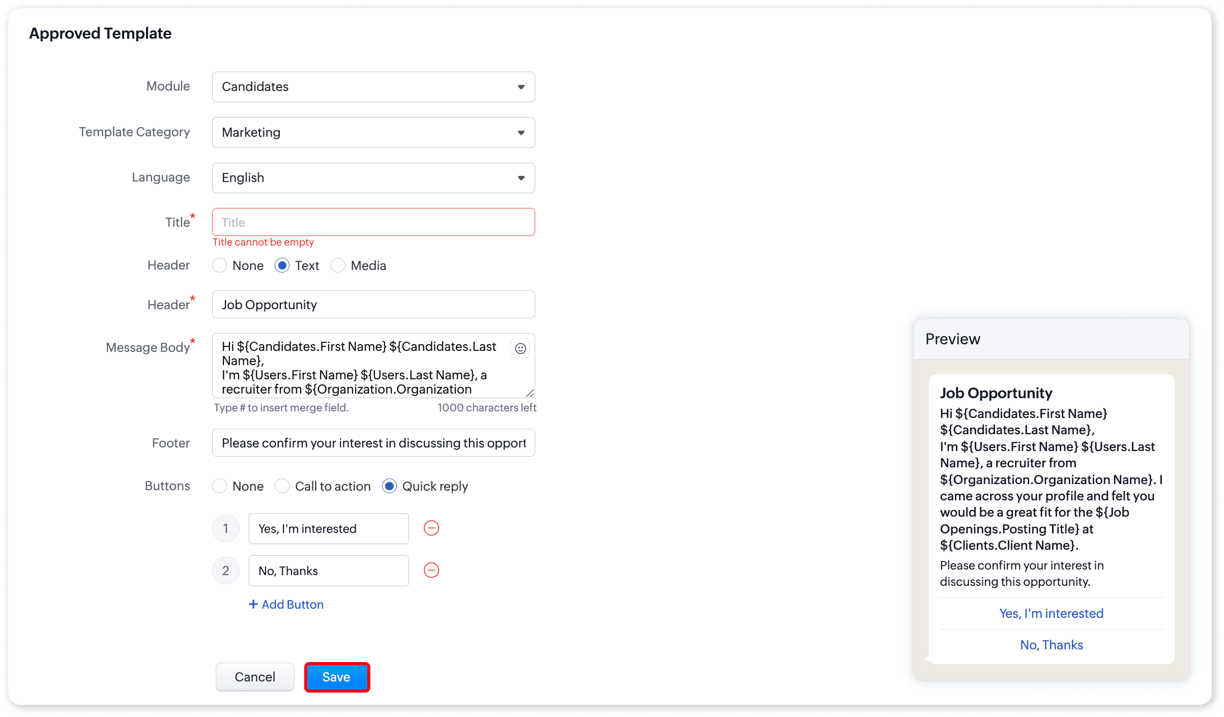 - Message Body (Mandatory): Craft the main body of your message, ensuring it adheres to your organization’s tone, language, and branding guidelines. Use the "" symbol to insert merge fields if needed.
