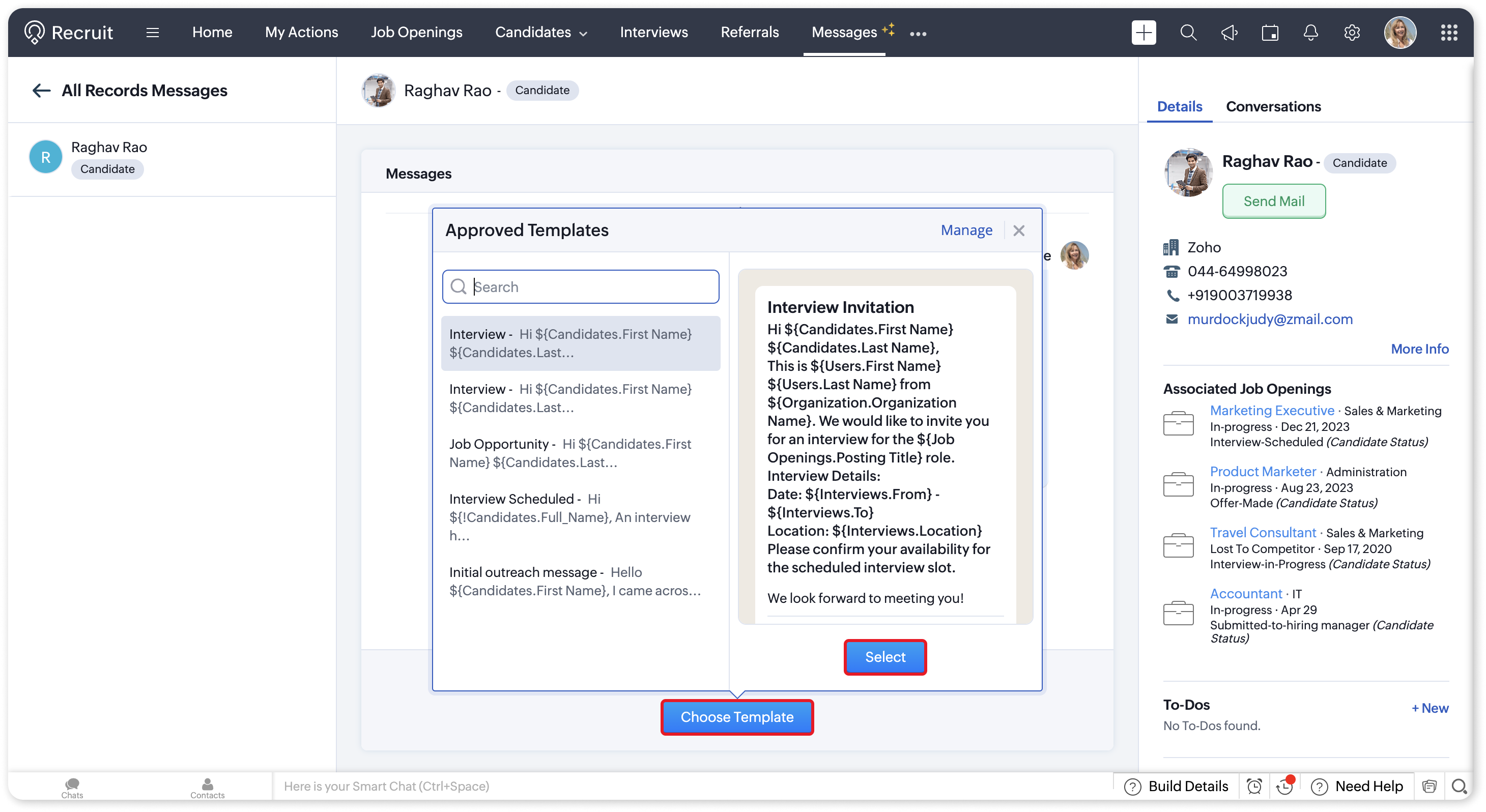 - Go to the Candidates module and select the desired candidate for sending an interactive message template.