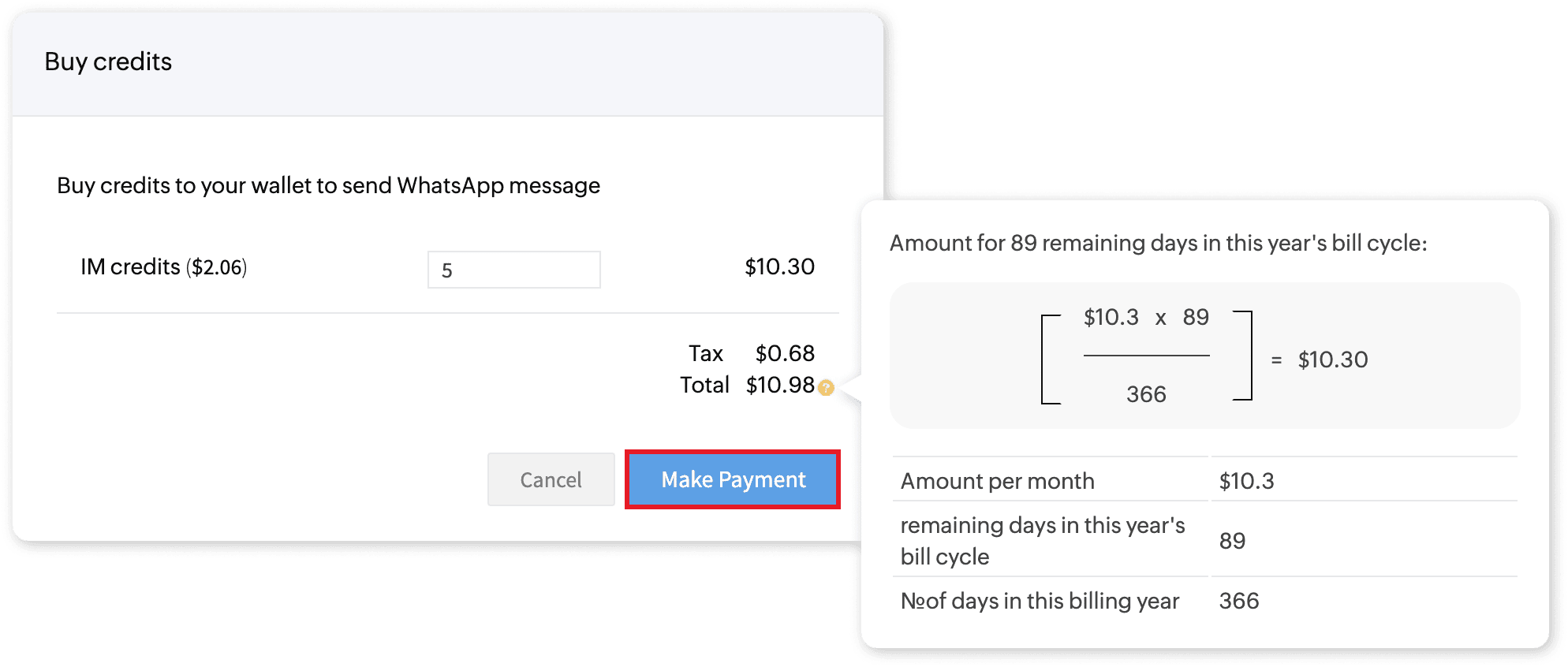 Amount for 89 remaining days in this year's bill cycle: