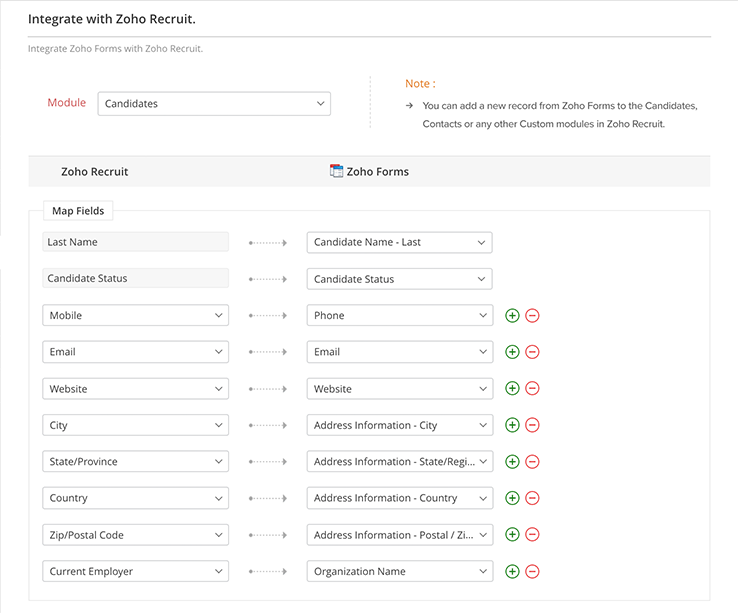 For agencies or corporate companies, collecting and processing candidate details, key information, skill set, assessments and is definitely a challenge owing to the huge volume of resumes that come in on a regular basis. With the Zoho Recruit and Zoho Forms integration, save time by building advanced forms and also automatically push data collected from into Recruit's modules upon submission of every entry.